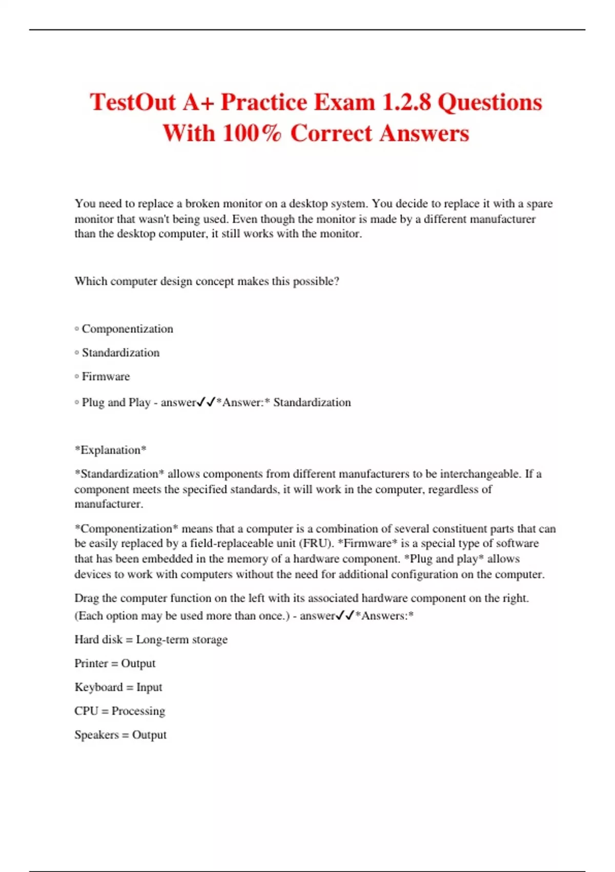 TestOut A+ Practice Exam 1.2.8 Questions With 100% Correct Answers You need to replace a broken monitor on a desktop system. You decide to replace it with a spare monitor that wasn't being used. Even though the monitor is made by a different manufacturer than the desktop computer, it still works with the monitor. Which computer design concept makes this possible? ▫ Componentization ▫ Standardization ▫ Firmware ▫ Plug and Play - answer*Answer:* Standardization *Explanation* *Standardization* allows components from different manufacturers to be interchangeable. If a component meets the specified standards, it will work in the computer, regardless of manufacturer. *Componentization* means that a computer is a combination of several constituent parts that can be easily replaced by a field-replaceable unit (FRU). *Firmware* is a special type of software that has been embedded in the memory of a hardware component. *Plug and play* allows devices to work with computers without the need for additional configuration on the computer. Drag the computer function on the left with its associated hardware component on the right. (Each option may be used more than once.) - answer*Answers:* Hard disk = Long-term storage Printer = Output Keyboard = Input CPU = Processing Speakers = Output RAM =Processing DVD-RW = Input Long-term storage Microphone = Output Input *Explanation* *Input:* Mouse, Keyboard, Scanner, Microphone *Output:* Monitor, Speaker, Printer *Processing:* CPU, RAM *Long-term Storage:* Hard disk drives, Solid-state drives, Optical drives, Flash drives. You are looking at a female TRS connector on the computer. Which device uses this connector? ▫ Keyboard ▫ Speaker ▫ Joystick ▫ Monitor - answer*Answer:* Speaker *Explanation* A *TRS* connector is used with audio connectors such as speakers and microphones. *Keyboards* use either a PS/2 connector or a USB connector. *Joysticks* typically use a USB connector, though some connect through a DB-15 connector. *Monitors* use one of the many graphic ports, such as a VGA port, DVI port, or HDMI port. You have purchased a new LED monitor for your computer. On the back of the monitor, you see the following port (pictured below). Which type of cable should you use to connect the monitor to your computer? ▫ Display Port cable ▫ HDMI cable ▫ VGA cable ▫ DVI cable - answer*Answer:* Display Port Cable You are connecting an older dot matrix printer to a computer. The printer's cable is a D-shaped connector with 25 pins. Which port type does the printer connect to? ▫ VGA port ▫ Serial port ▫ USB port ▫ Parallel port - answer*Answer:* Parallel Port *Explanation* A D-shaped, 25-pin connector connects to a computer's parallel port (DB-25 port). *Parallel connectors* are used with older devices, such as dot matrix printers. *Serial ports* have nine pins and are used with serial devices (e.g., barcode scanners). *VGA ports* have 15 pins (three rows of five pins) and are used with VGA monitors. *USB ports* are rectangular in shape and typically aren't used with older devices. You are providing telephone support for a user who is trying to connect a computer to a projector. You know that the projector only has a VGA port. How would you describe the connector that the user should look for? ▫ Round with 6 pins ▫ D-shaped with 25 pins ▫ Rectangular with one beveled corner ▫ D-shaped with 15 pins - answer*Answer:* D-Shaped with 15 pins *Explanation* *VGA ports*, also called DE-15 ports, are named for their characteristic D-shape and 15 pins.
