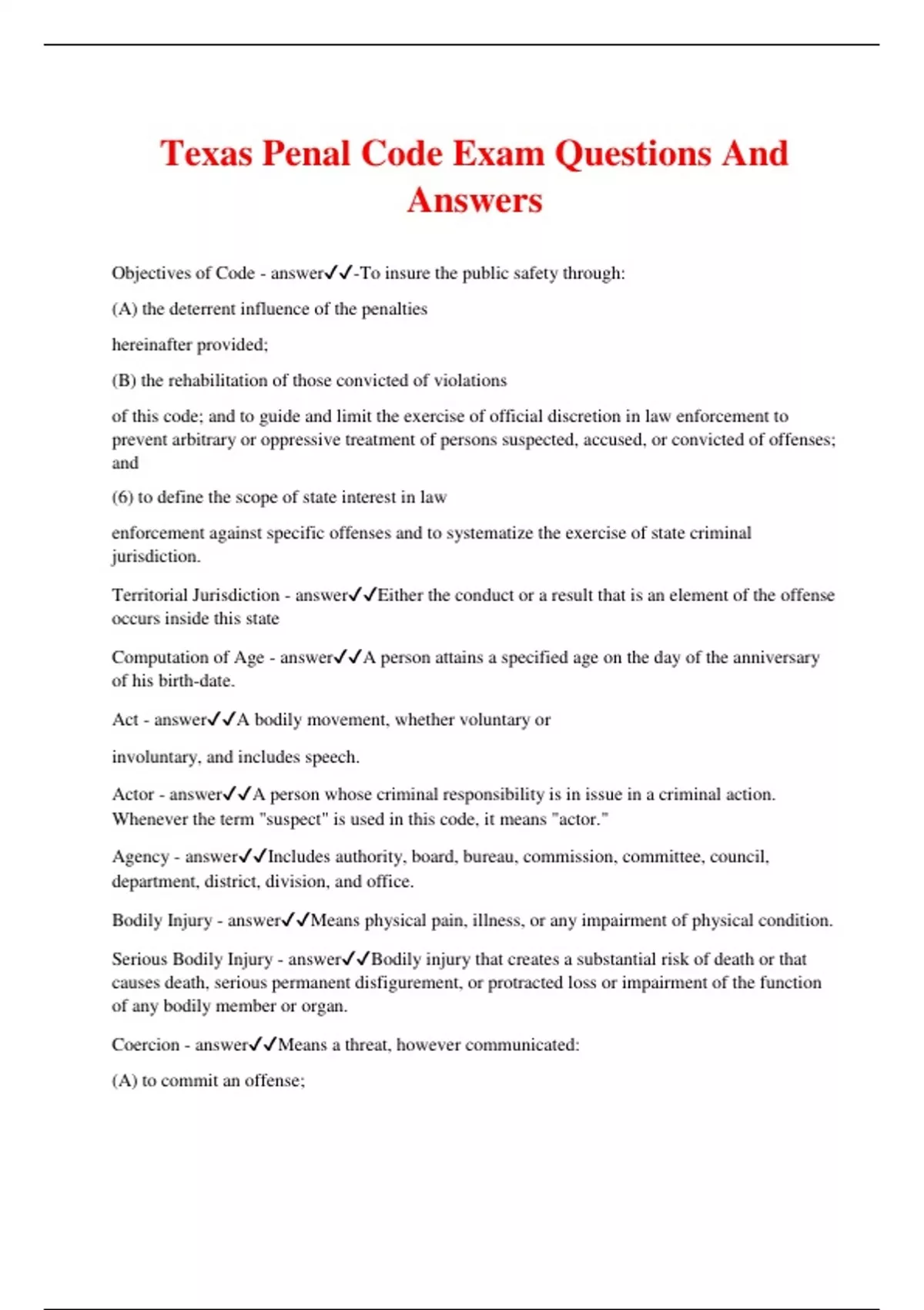 Texas Penal Code Exam Questions And Answers Objectives of Code - answer-To insure the public safety through: (A) the deterrent influence of the penalties hereinafter provided; (B) the rehabilitation of those convicted of violations of this code; and to guide and limit the exercise of official discretion in law enforcement to prevent arbitrary or oppressive treatment of persons suspected, accused, or convicted of offenses; and (6) to define the scope of state interest in law enforcement against specific offenses and to systematize the exercise of state criminal jurisdiction. Territorial Jurisdiction - answerEither the conduct or a result that is an element of the offense occurs inside this state Computation of Age - answerA person attains a specified age on the day of the anniversary of his birth-date. Act - answerA bodily movement, whether voluntary or involuntary, and includes speech. Actor - answerA person whose criminal responsibility is in issue in a criminal action. Whenever the term "suspect" is used in this code, it means "actor." Agency - answerIncludes authority, board, bureau, commission, committee, council, department, district, division, and office. Bodily Injury - answerMeans physical pain, illness, or any impairment of physical condition. Serious Bodily Injury - answerBodily injury that creates a substantial risk of death or that causes death, serious permanent disfigurement, or protracted loss or impairment of the function of any bodily member or organ. Coercion - answerMeans a threat, however communicated: (A) to commit an offense; (B) to inflict bodily injury in the future on the person threatened or another; (C) to accuse a person of any offense; (D) to expose a person to hatred, contempt, or ridicule; (E) to harm the credit or business repute of any person; or (F) to take or withhold action as a public servant, or to cause a public servant to take or withhold action. Conduct - answerMeans an act or omission and its accompanying mental state. Correctional Facility - answerMeans a place designated by law for the confinement of a person arrested for, charged with, or convicted of a criminal offense. The term includes: (A) a municipal or county jail; (B) a confinement facility operated by the Texas Department of Criminal Justice; (C) a confinement facility operated under contract with any division of the Texas Department of Criminal Justice; and (D) a community corrections facility operated by a community supervision and corrections department. Deadly Weapon - answerA firearm or anything manifestly designed, made, or adapted for the purpose of inflicting death or serious bodily injury; or (B) anything that in the manner of its use or intended use is capable of causing death or serious bodily injury. Consent - answerMeans assent in fact, whether express or apparent. Effective Consent - answerIncludes consent by a person legally authorized to act for the owner. Consent is not effective if: (A) induced by force, threat, or fraud; (B) given by a person the actor knows is not legally authorized to act for the owner; (C) given by a person who by reason of youth, mental disease or defect, or intoxication is known by the actor to be unable to make reasonable decisions; or (D) given solely to detect the commission of an offense. Element of Offense - answer(A) The forbidden conduct; (B) The required culpability; (C) Any required result; and (D) The negation of any exception to the offense. Felony - answerAn offense so designated by law or punishable by death or confinement in a penitentiary. Harm - answerAnything reasonably regarded as loss, disadvantage, or injury, including harm to another person in whose welfare the person affected is interested. Individual - answerA human being who is alive, including an unborn child at every stage of gestation from fertilization until birth. Misdemeanor - answerAn offense so designated by law or punishable by fine, by confinement in jail, or by both fine and confinement in jail. Possession - answerMeans actual care, custody, control, or management. Public Place - answerAny place to which the public or a substantial group of the public has access and includes, but is not limited to, streets, highways, and the common areas of schools, hospitals, apartment houses, office buildings, transport facilities, and shops. Public Servant - answerA person elected, selected, appointed, employed, or otherwise designated as one of the following, even if he has not yet qualified for office or assumed his duties: (A) an officer, employee, or agent of government; (B) a juror or grand juror; or (C) an arbitrator, referee, or other person who is authorized by law or private written agreement to hear or determine a cause or controversy; or (D) an attorney at law or notary public when participating in the performance of a governmental function; or (E) a candidate for nomination or election to public office; or (F) a person who is performing a governmental function under a claim of right although he is not legally qualified to do so. Reasonable Belief - answerA belief that would be held by an ordinary and prudent man in the same circumstances as the actor. Secure Correctional Facility - answerA municipal or county jail; or (B) a confinement facility operated by or under a contract with any division of the Texas Department of Criminal Justice. Unlawful - answerCriminal or tortuous or both and includes what would be criminal or tortuous but for a defense not amounting to justification or privilege. Death - answerFor an individual who is an unborn child, the failure to be born alive. Prosecuting Attorney - answerProve beyond a reasonable doubt that the defendant or defendant's conduct does not fall within the exception. Proof Beyond a Reasonable Doubt - answerAll persons are presumed to be innocent and no person may be convicted of an offense unless each element of the offense is proved beyond a reasonable doubt. Presumption - answerIf there is sufficient evidence of the