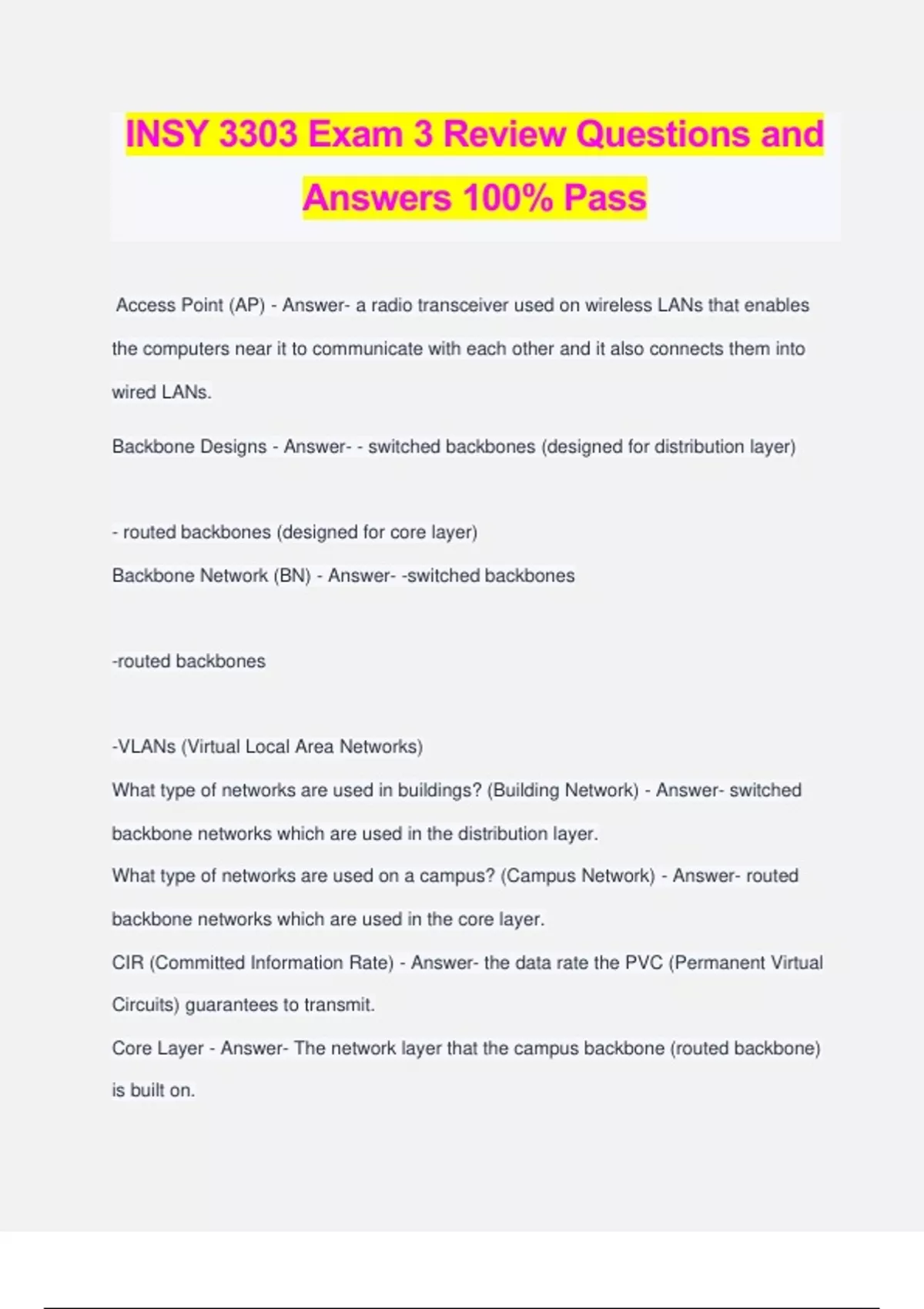 INSY 3303 Exam 3 Review Questions and Answers 100% Pass Access Point (AP) - Answer- a radio transceiver used on wireless LANs that enables the computers near it to communicate with each other and it also connects them into wired LANs. Backbone Designs - Answer- - switched backbones (designed for distribution layer) - routed backbones (designed for core layer) Backbone Network (BN) - Answer- -switched backbones -routed backbones -VLANs (Virtual Local Area Networks) What type of networks are used in buildings? (Building Network) - Answer- switched backbone networks which are used in the distribution layer. What type of networks are used on a campus? (Campus Network) - Answer- routed backbone networks which are used in the core layer. CIR (Committed Information Rate) - Answer- the data rate the PVC (Permanent Virtual Circuits) guarantees to transmit. Core Layer - Answer- The network layer that the campus backbone (routed backbone) is built on. CSMA/CD (Carrier Sense Multiple Access with Collision Detection) - Answer- A contention based media access control technique where computers wait until the circuit is free before transmitting, that can also detects collisions by jamming the signals. CSU/DSU (Channel Service Unit/Data Service Unit) - Answer- a device that is the WAN equivalent of a NIC that takes the outgoing packet and translates it to use the data link layer and network protocols used in the WAN. Distribution Layer - Answer- the network layer that building backbones (switched backbones) are built on. ESP (Encapsulating Security Payload) - Answer- an encapsulated packet that is encrypted using IPSec encryption and contains the IP packet, TCP segment and HTTP packet. Ethernet - Answer- a layer 2 protocol that operates at the data link layer developed by DEC, Xerox and Intel. Wired Ethernet (IEEE 802.3) Wireless Ethernet (IEEE 802.11) Forwarding Table - Answer- a table that lists the Ethernet address of the computer connected to each port on the switch