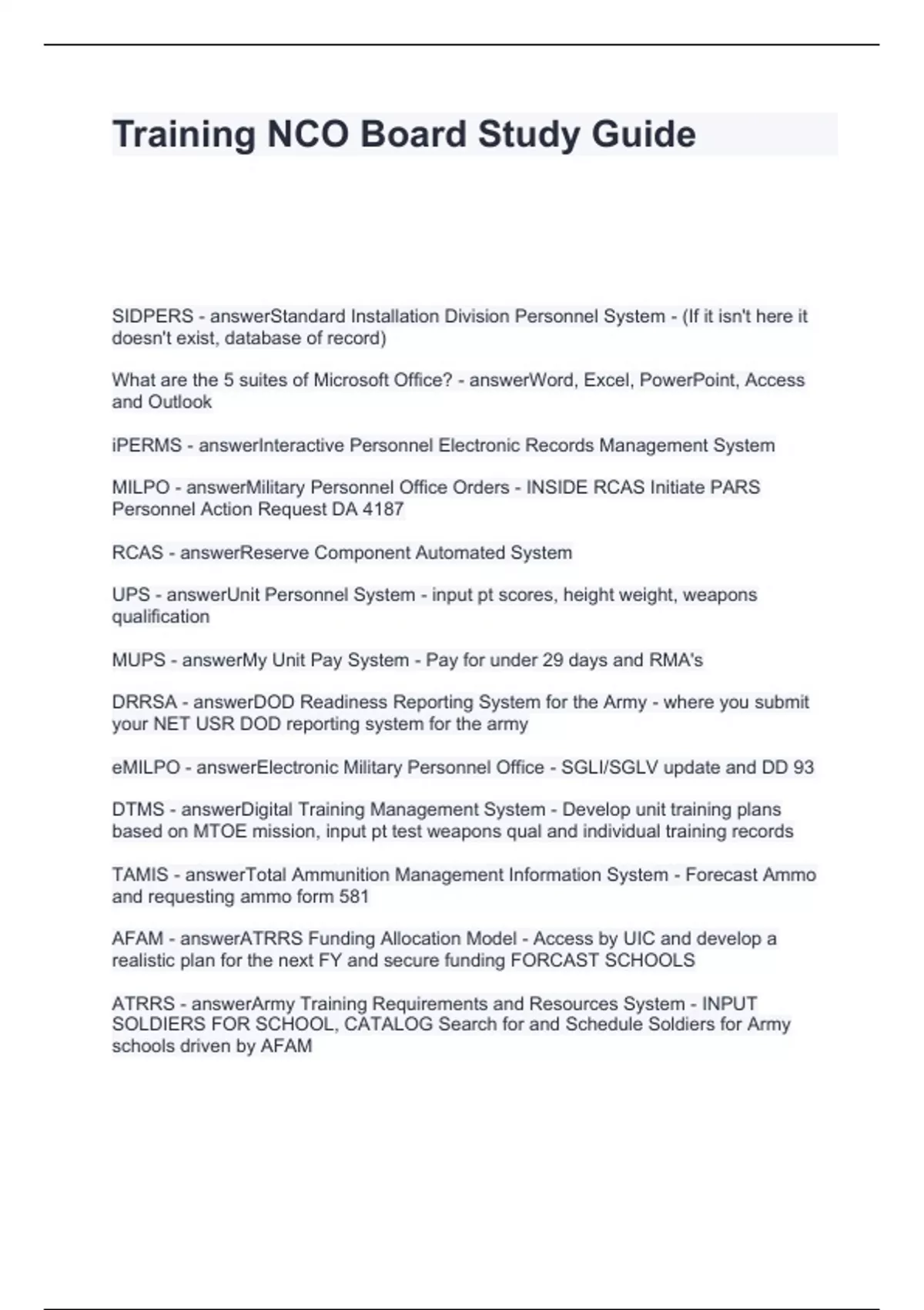 Training NCO Board Study Guide Questions and Answers 2024