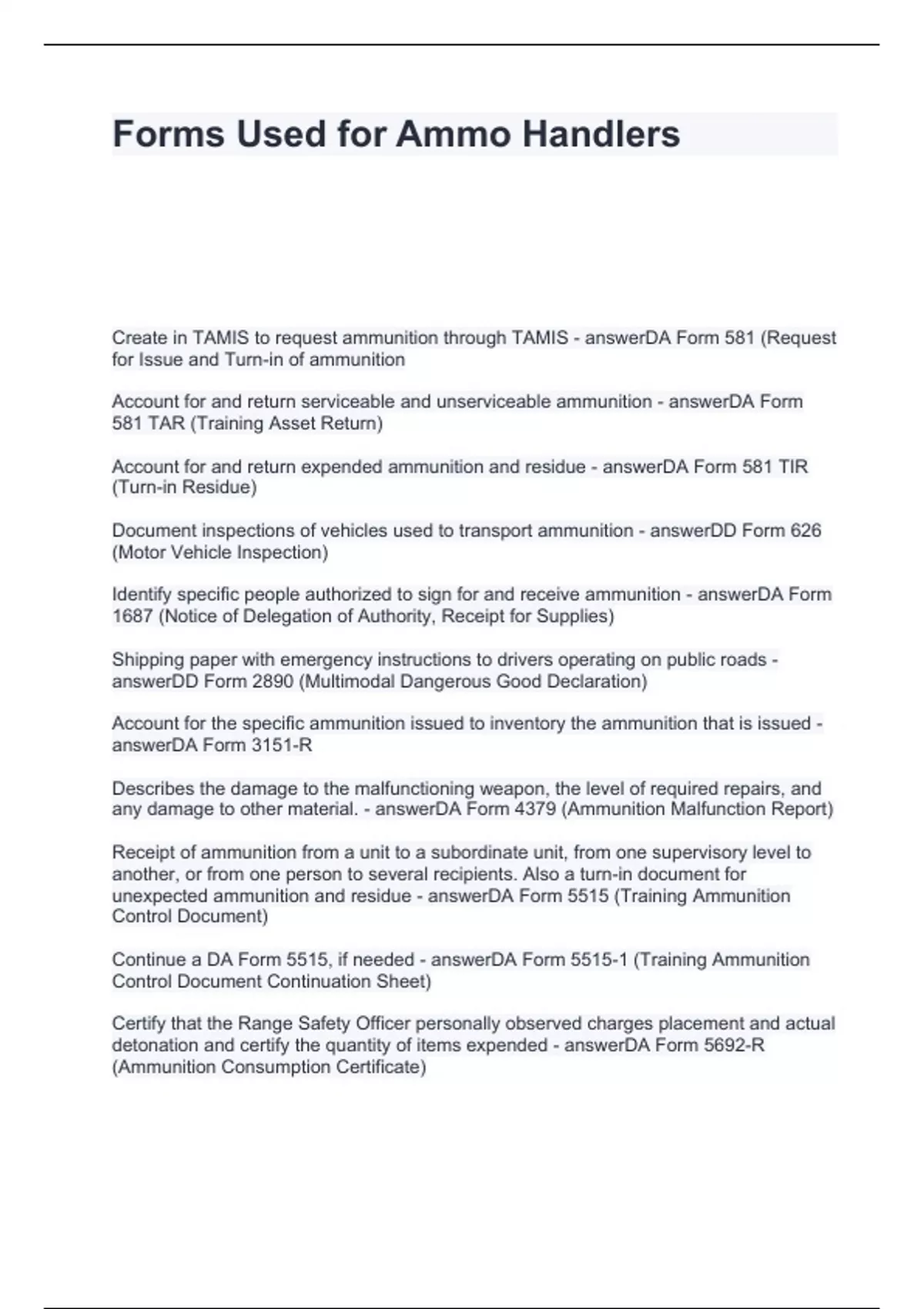 Forms Used for Ammo Handlers Questions and Answers Latest Updated