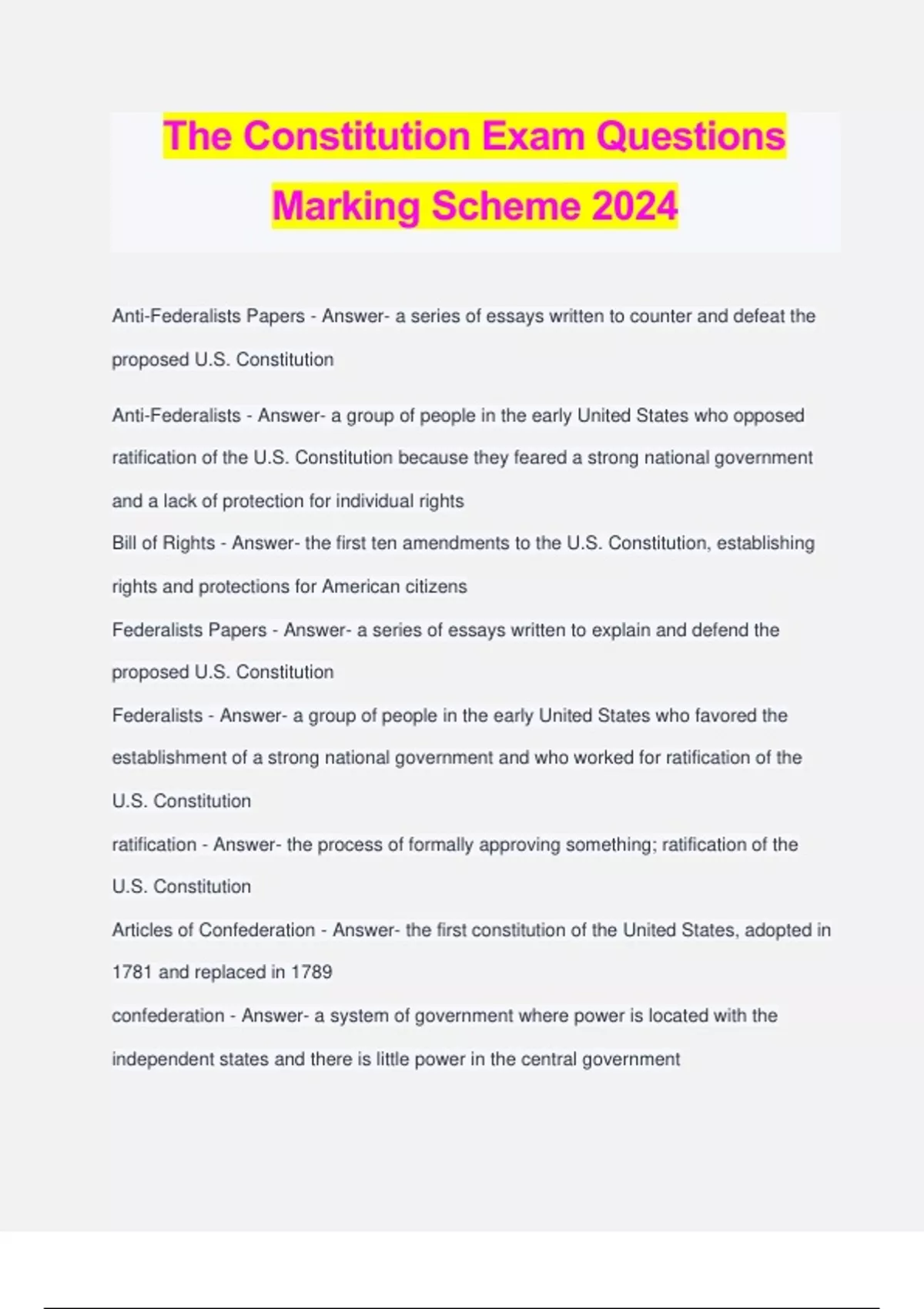 The Constitution Exam Questions Marking Scheme 2024 Anti-Federalists Papers - Answer- a series of essays written to counter and defeat the proposed U.S. Constitution Anti-Federalists - Answer- a group of people in the early United States who opposed ratification of the U.S. Constitution because they feared a strong national government and a lack of protection for individual rights Bill of Rights - Answer- the first ten amendments to the U.S. Constitution, establishing rights and protections for American citizens Federalists Papers - Answer- a series of essays written to explain and defend the proposed U.S. Constitution Federalists - Answer- a group of people in the early United States who favored the establishment of a strong national government and who worked for ratification of the U.S. Constitution ratification - Answer- the process of formally approving something; ratification of the U.S. Constitution Articles of Confederation - Answer- the first constitution of the United States, adopted in 1781 and replaced in 1789 confederation - Answer- a system of government where power is located with the independent states and there is little power in the central government