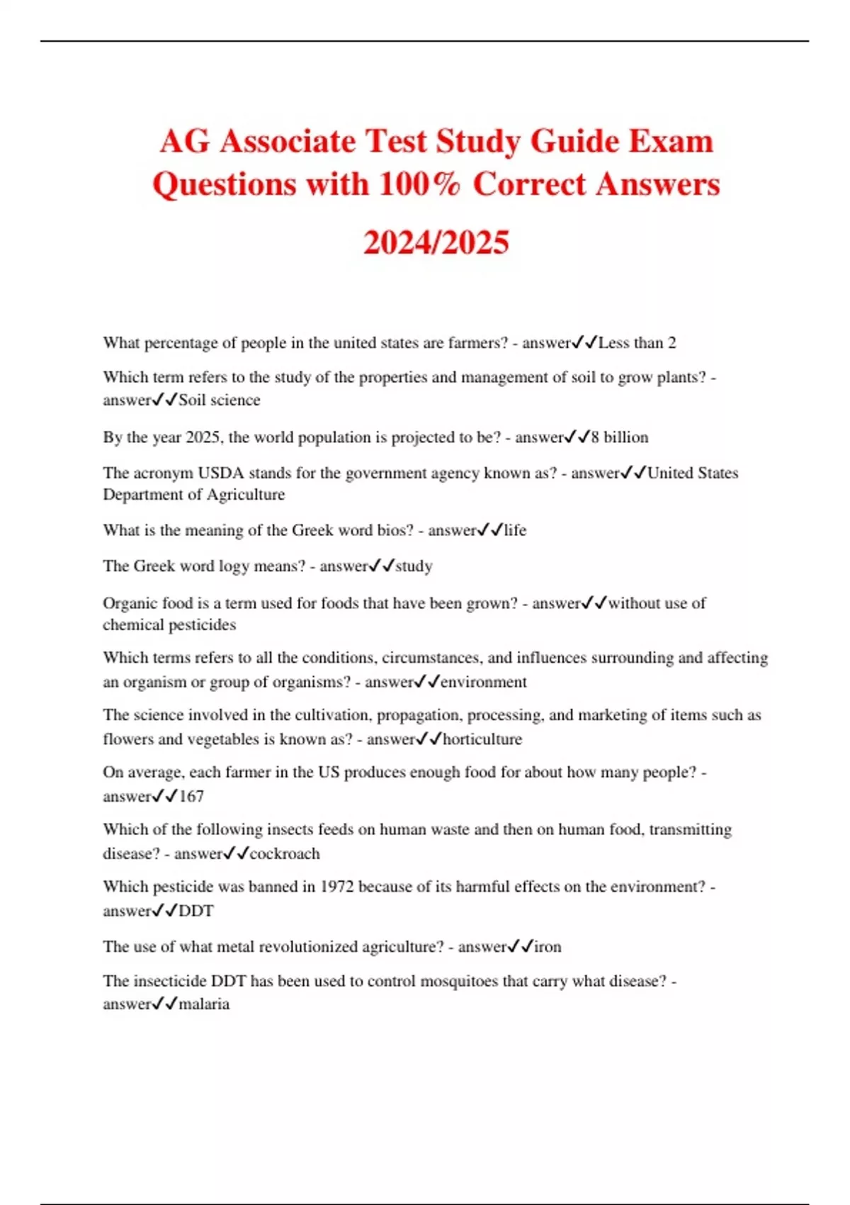 AG Associate Test Study Guide Exam Questions with 100% Correct Answers 2024/2025 What percentage of people in the united states are farmers? - answerLess than 2 Which term refers to the study of the properties and management of soil to grow plants? - answerSoil science By the year 2025, the world population is projected to be? - answer8 billion The acronym USDA stands for the government agency known as? - answerUnited States Department of Agriculture What is the meaning of the Greek word bios? - answerlife The Greek word logy means? - answerstudy Organic food is a term used for foods that have been grown? - answerwithout use of chemical pesticides Which terms refers to all the conditions, circumstances, and influences surrounding and affecting an organism or group of organisms? - answerenvironment The science involved in the cultivation, propagation, processing, and marketing of items such as flowers and vegetables is known as? - answerhorticulture On average, each farmer in the US produces enough food for about how many people? - answer167 Which of the following insects feeds on human waste and then on human food, transmitting disease? - answercockroach Which pesticide was banned in 1972 because of its harmful effects on the environment? - answerDDT The use of what metal revolutionized agriculture? - answeriron The insecticide DDT has been used to control mosquitoes that carry what disease? - answermalaria when a tree or other plant is not affected by the presence of a harmful insect, it is described as being? - answerimmune what two insects are beneficial to plants - answerbees and ladybird beetles which of the following is a plant that hosts nitrogen-fixing bacteria? - answerlegume an infection of the milk-secreting glands of cattle, goats and other milk producing animals is known as? - answermastitis Agriscience accounts for what percentage of jobs in America - answer14 What is a type of potato grown in the volcanic soils of Idaho and the Northwest? - answerRusset The average U.S. farmer produces enough food to feed about how many people? - answer167 What percentage of careers in agriscience require college degrees? - answer20 Agriculture processing, products, and distribution are those parts of the industry that do what with the commodities? - answerhaul, grade, process, package, and market A career in food science includes: - answerprocessing, packaging, distribution of, and marketing of food products Qualifications for a career in renewable natural resources include an appreciation for natural and scientific knowledge of plants and? - answeranimals The area of agriscience that includes businesses that sell supplies or provide services is? - answeragricultural supplies and services another term for resume is a - answervita the SCANS report was written by the - answerSecretary's commission on achieving necessary skills in what order are college degrees earned - answerfour-year, master, doctorate a global positioning systems technician is most likely found in which career area? - answerag mechanics which cabinet level secretart developed the SCANS report? - answersecretary of labor Farming and ranching fall under which career area - answerproduction agrigulture of people needed each year to fill positions in the agriculture industry, approximately how many have the required skills and knowledge - answer100,000