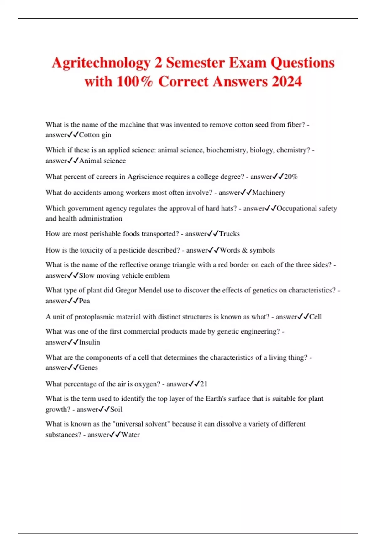 Agritechnology 2 Semester Exam Questions with 100% Correct Answers 2024 What is the name of the machine that was invented to remove cotton seed from fiber? - answerCotton gin Which if these is an applied science: animal science, biochemistry, biology, chemistry? - answerAnimal science What percent of careers in Agriscience requires a college degree? - answer20% What do accidents among workers most often involve? - answerMachinery Which government agency regulates the approval of hard hats? - answerOccupational safety and health administration How are most perishable foods transported? - answerTrucks How is the toxicity of a pesticide described? - answerWords & symbols What is the name of the reflective orange triangle with a red border on each of the three sides? - answerSlow moving vehicle emblem What type of plant did Gregor Mendel use to discover the effects of genetics on characteristics? - answerPea A unit of protoplasmic material with distinct structures is known as what? - answerCell What was one of the first commercial products made by genetic engineering? - answerInsulin What are the components of a cell that determines the characteristics of a living thing? - answerGenes What percentage of the air is oxygen? - answer21 What is the term used to identify the top layer of the Earth's surface that is suitable for plant growth? - answerSoil What is known as the "universal solvent" because it can dissolve a variety of different substances? - answerWater