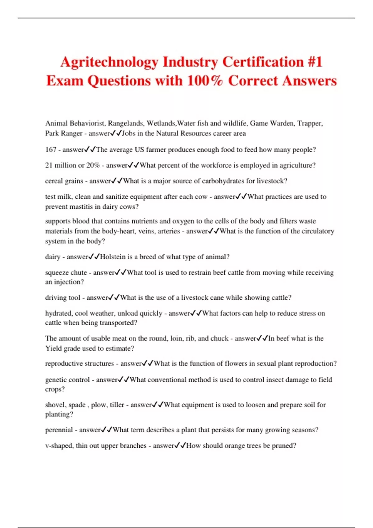 Agritechnology Industry Certification #1 Exam Questions with 100% Correct Answers Animal Behaviorist, Rangelands, Wetlands,Water fish and wildlife, Game Warden, Trapper, Park Ranger - answerJobs in the Natural Resources career area 167 - answerThe average US farmer produces enough food to feed how many people? 21 million or 20% - answerWhat percent of the workforce is employed in agriculture? cereal grains - answerWhat is a major source of carbohydrates for livestock? test milk, clean and sanitize equipment after each cow - answerWhat practices are used to prevent mastitis in dairy cows? supports blood that contains nutrients and oxygen to the cells of the body and filters waste materials from the body-heart, veins, arteries - answerWhat is the function of the circulatory system in the body? dairy - answerHolstein is a breed of what type of animal? squeeze chute - answerWhat tool is used to restrain beef cattle from moving while receiving an injection? driving tool - answerWhat is the use of a livestock cane while showing cattle? hydrated, cool weather, unload quickly - answerWhat factors can help to reduce stress on cattle when being transported? The amount of usable meat on the round, loin, rib, and chuck - answerIn beef what is the Yield grade used to estimate? reproductive structures - answerWhat is the function of flowers in sexual plant reproduction? genetic control - answerWhat conventional method is used to control insect damage to field crops? shovel, spade , plow, tiller - answerWhat equipment is used to loosen and prepare soil for planting? perennial - answerWhat term describes a plant that persists for many growing seasons? v-shaped, thin out upper branches - answerHow should orange trees be pruned?