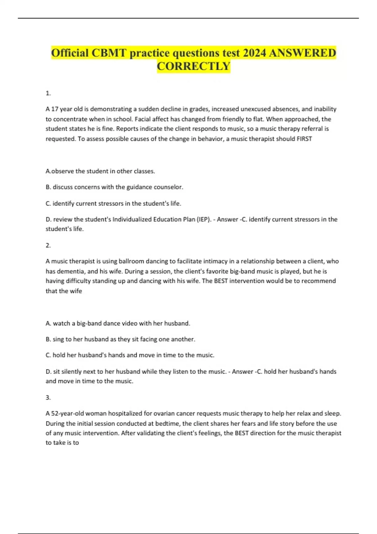 Official CBMT practice questions test 2024 ANSWERED CORRECTLY 1. A 17 year old is demonstrating a sudden decline in grades, increased unexcused absences, and inability to concentrate when in school. Facial affect has changed from friendly to flat. When approached, the student states he is fine. Reports indicate the client responds to music, so a music therapy referral is requested. To assess possible causes of the change in behavior, a music therapist should FIRST A.observe the student in other classes. B. discuss concerns with the guidance counselor. C. identify current stressors in the student's life. D. review the student's Individualized Education Plan (IEP). - Answer -C. identify current stressors in the student's life. 2. A music therapist is using ballroom dancing to facilitate intimacy in a relationship between a client, who has dementia, and his wife. During a session, the client's favorite big-band music is played, but he is having difficulty standing up and dancing with his wife. The BEST intervention would be to recommend that the wife A. watch a big-band dance video with her husband. B. sing to her husband as they sit facing one another. C. hold her husband's hands and move in time to the music. D. sit silently next to her husband while they listen to the music. - Answer -C. hold her husband's hands and move in time to the music. 3. A 52-year-old woman hospitalized for ovarian cancer requests music therapy to help her relax and sleep. During the initial session conducted at bedtime, the client shares her fears and life story before the use of any music intervention. After validating the client's feelings, the BEST direction for the music therapist to take is to
