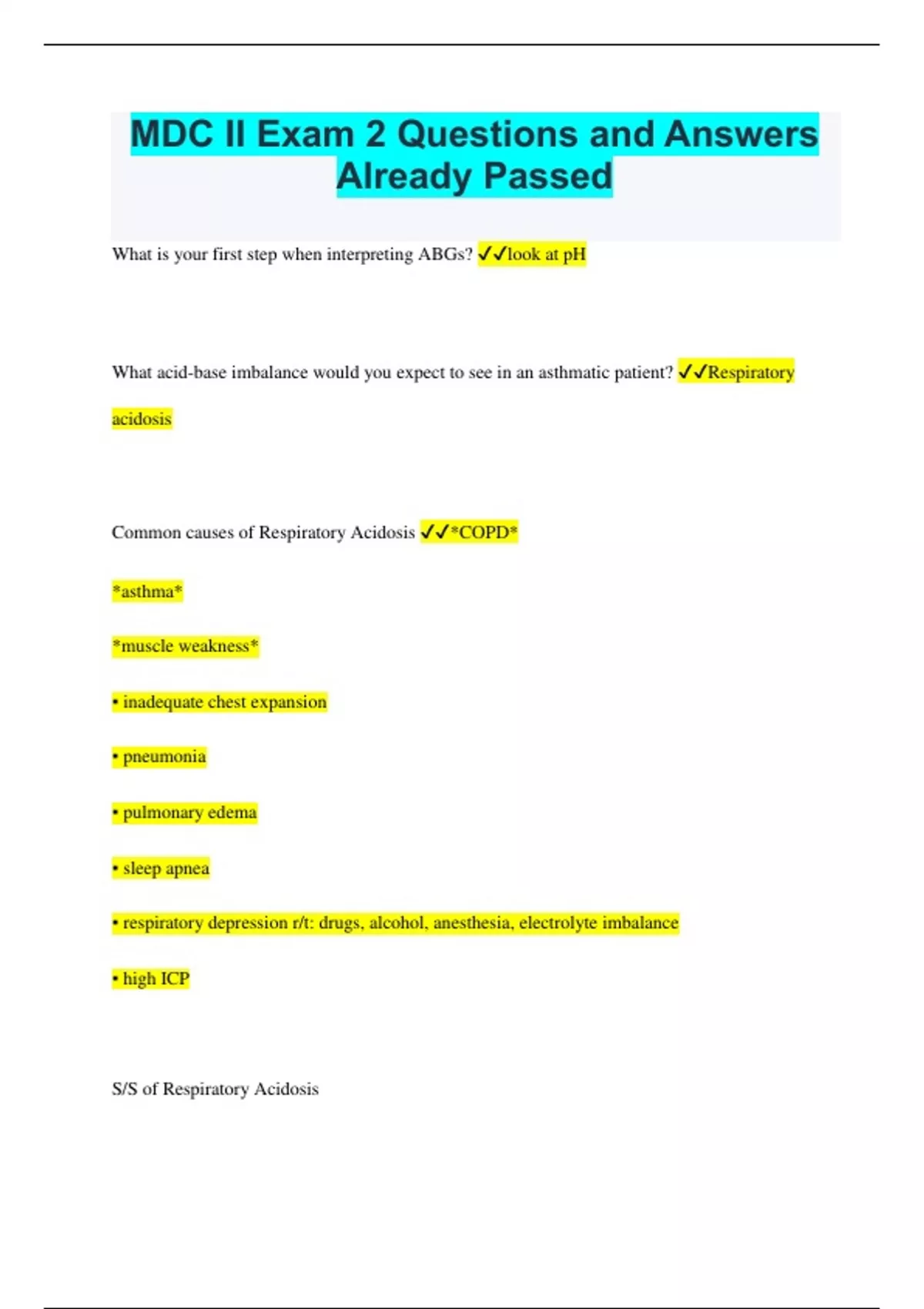 MDC II Exam 2 Questions and Answers Already Passed What is your first step when interpreting ABGs? look at pH What acid-base imbalance would you expect to see in an asthmatic patient? Respiratory acidosis Common causes of Respiratory Acidosis *COPD* *asthma* *muscle weakness* ▪ inadequate chest expansion ▪ pneumonia ▪ pulmonary edema ▪ sleep apnea ▪ respiratory depression r/t: drugs, alcohol, anesthesia, electrolyte imbalance ▪ high ICP S/S of Respiratory Acidosis (acidosis has similar s/s no matter if met. or resp.) *Vital Signs, think LOW & SLOW* ▪ bradycardia, thready weak pulses ▪ hypotension ▪ hypoxia *Electrolyte Imbalance* ▪ hyperkalemia *Skin* ▪ pale, cyanotic *CNS Depression, think LOW & SLOW* ▪ lethargy ▪ confusion ▪ stupor ▪ coma ▪ headache *Musculoskeletal, think LOW & SLOW* ▪ hyporeflexia ▪ muscle weakness ▪ flaccid paralysis *Cardiac* ▪ heart dysrhythmias (due to hyperkalemia) ▪ increased cardiac output ▪ EKG changes - tall T waves, wide QRS, prolonged PR interval Treatment for Respiratory Acidosis *stabilize airway (patent)* *bronchodilators* ▪ O2 ▪ Pulmonary hygiene (positioning and breathing/coughing techniques) ▪ Suction PRN ▪ If on ventilation, increase ventilation rate. ▪ Endotracheal intubation For underlying causes: ▪ Correct electrolyte balance (hyperkalemia) ▪ Antibiotics (if it's infection) What does your body do to compensate for respiratory acidosis? ▪ increase respirations to increase pH Nursing Diagnosis for Respiratory Acidosis ▪ impaired gas exchange low pH, high CO2 respiratory acidosis low pH, low HCO3 metabolic acidosis
