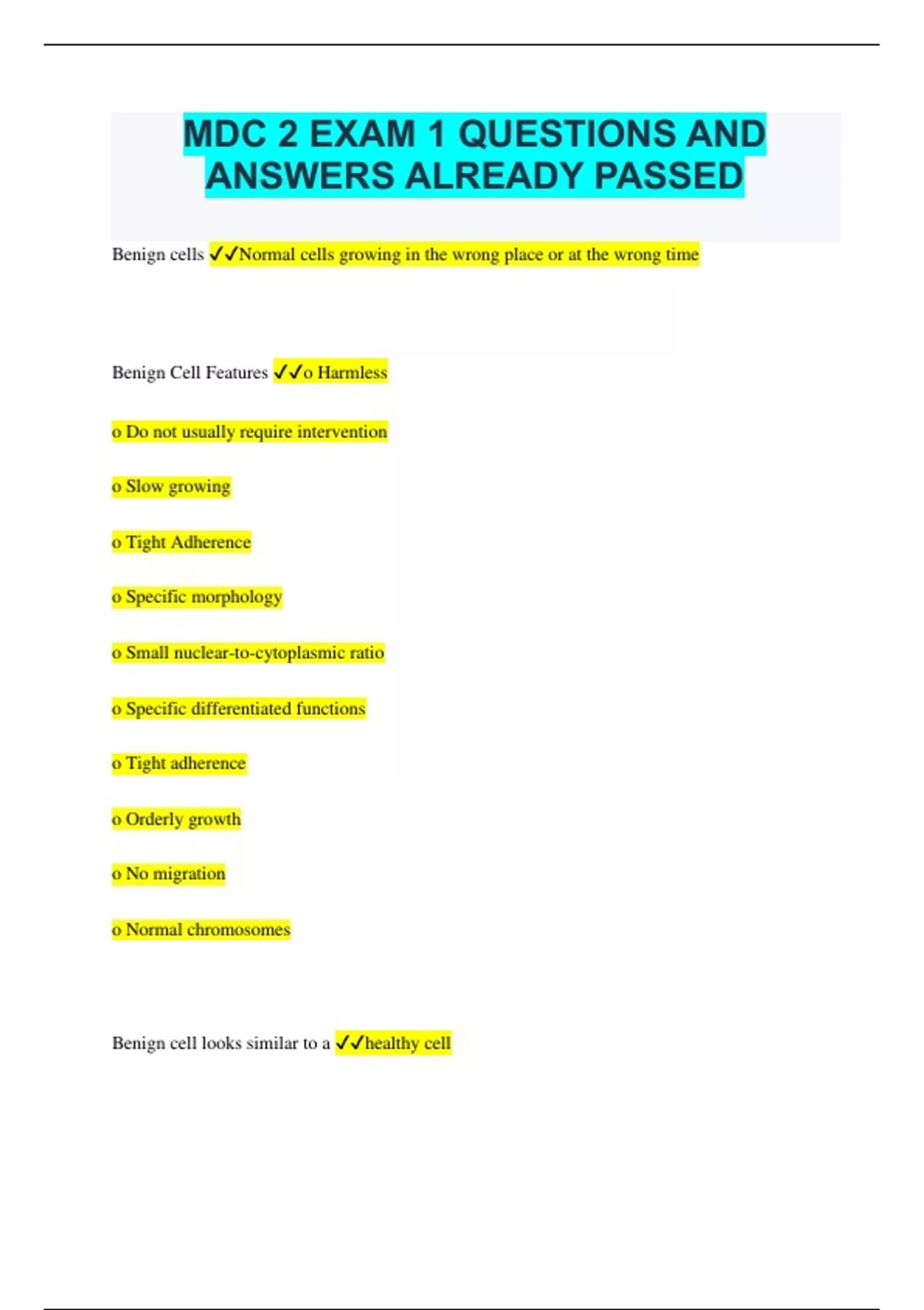 MDC 2 EXAM 1 QUESTIONS AND ANSWERS ALREADY PASSED Benign cells Normal cells growing in the wrong place or at the wrong time Benign Cell Features o Harmless o Do not usually require intervention o Slow growing o Tight Adherence o Specific morphology o Small nuclear-to-cytoplasmic ratio o Specific differentiated functions o Tight adherence o Orderly growth o No migration o Normal chromosomes Benign cell looks similar to a healthy cell Examples of Benign cells o Skin Tag o Mole o Nasal Polyp o Uterine Fibroids o Endometriosis Malignant cells indicates cancer and can be harmful to normal body tissues and result in death Malignant cell features o Large nucleus o Migration o Doesn't stop and replicates (No contact inhibition) o Loose adherence o Rapid or continuous cell division o Loss of cellular regulation o Abnormal chromosomes (< or > 23) Seven warning signs of cancer o C-Change in bowel or bladder patterns o A-A sore that doesn't heal o U-Unusual bleeding or d/c o. T-Thickening or lump on breast or elsewhere o I-Indigestion or difficulty swallowing o O-Obvious change in wart or mole o N-Nagging cough or hoarseness Cancer development stages of malignancy o Initiation o Promotion o Progression o Metastasis Initiation (Stage of malignancy) Normal cells are damaged and irreversible Promotion Repeated exposure>Enhances growth of malignant cells Progression Increase in production of malignant cells Metastasis Cells move from primary site to the rest of the body Carcinogenesis/oncogenesis cancer development Cancer classification o Grading o Ploidy o Staging o TNM o Doubling time and mitotic index Grading Looking under microscope and determine