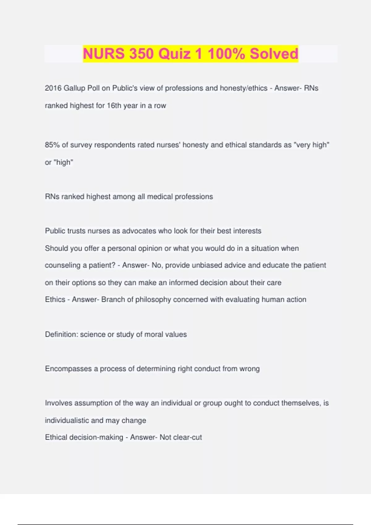 NURS 350 Quiz 1 100% Solved 2016 Gallup Poll on Public's view of professions and honesty/ethics - Answer- RNs ranked highest for 16th year in a row 85% of survey respondents rated nurses' honesty and ethical standards as "very high" or "high" RNs ranked highest among all medical professions Public trusts nurses as advocates who look for their best interests Should you offer a personal opinion or what you would do in a situation when counseling a patient? - Answer- No, provide unbiased advice and educate the patient on their options so they can make an informed decision about their care Ethics - Answer- Branch of philosophy concerned with evaluating human action Definition: science or study of moral values Encompasses a process of determining right conduct from wrong Involves assumption of the way an individual or group ought to conduct themselves, is individualistic and may change Ethical decision-making - Answer- Not clear-cut Brings up moral uncertainty Ethics committees - Answer- Deal with: -End of life issues -DNR -Informed consent -Organ donation Nurses serve on these committees Ethical issues faced by nurses today - Answer- Healthcare reform Uninsured Poor Nursing shortage End of life issues Strikes Rationing of care Drug and alcohol impairment Greatest challenge in ethics - Answer- Your choice may not be popular Listen to your "inner compass" Decisions not always linear Can a bad choice be repaired? THINK before you respond You ALWAYS have a choice! Autonomy - Answer- Right of self-determination Choice, independence, and freedom from controlling influences Respect for the individual, each person is unique and equal to others Dignity, inherent worth, self-reliance, individualism and power, personal liberty Beneficence - Answer- Obligation to do good, not harm Prevent evil or harm Act in best interest of the client Nonmaleficence - Answer- Prohibition of intentional harm -ex. family member abuse, drug/alcohol-impair