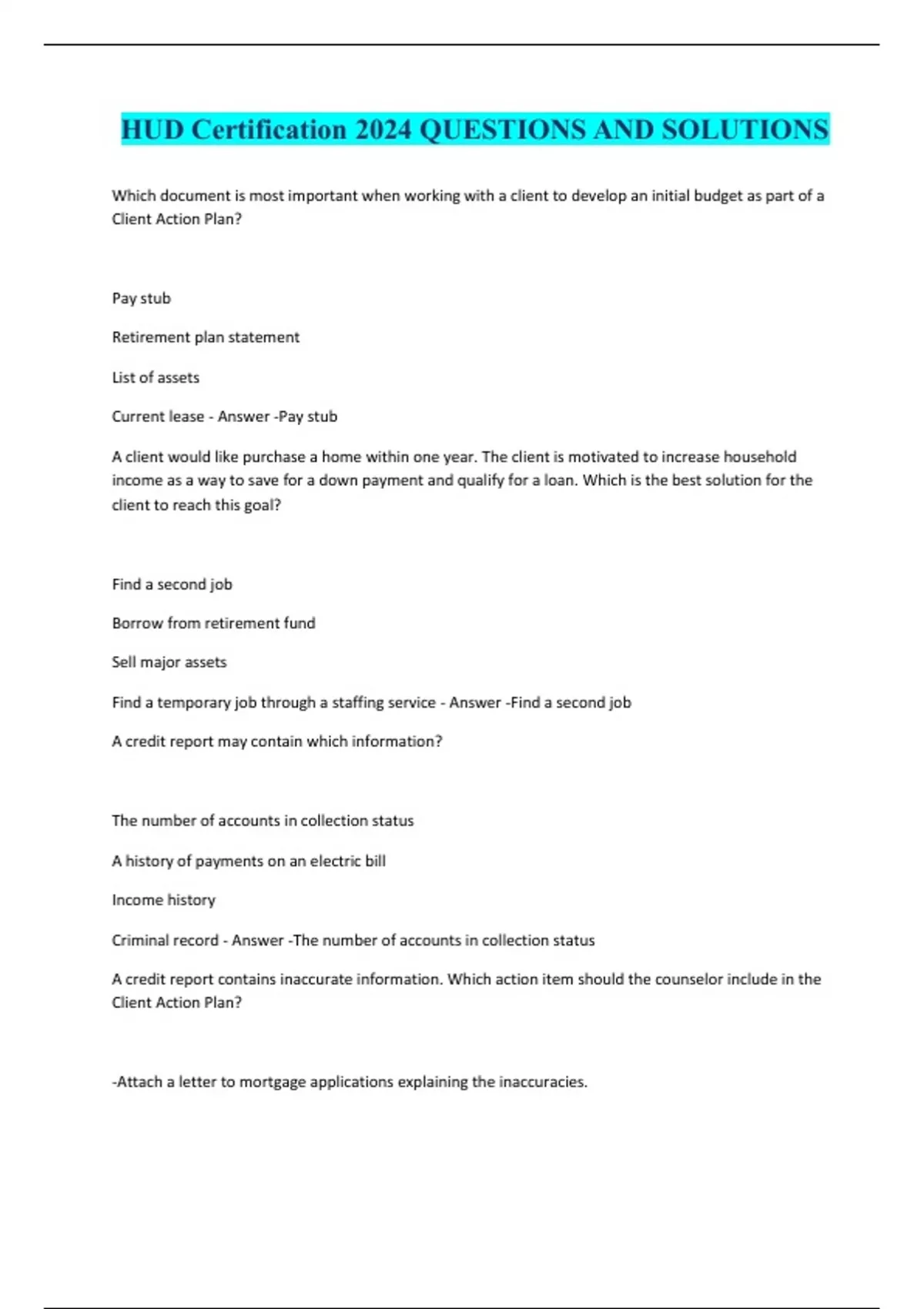 HUD Certification 2024 QUESTIONS AND SOLUTIONS Which document is most important when working with a client to develop an initial budget as part of a Client Action Plan? Pay stub Retirement plan statement List of assets Current lease - Answer -Pay stub A client would like purchase a home within one year. The client is motivated to increase household income as a way to save for a down payment and qualify for a loan. Which is the best solution for the client to reach this goal? Find a second job Borrow from retirement fund Sell major assets Find a temporary job through a staffing service - Answer -Find a second job A credit report may contain which information? The number of accounts in collection status A history of payments on an electric bill Income history Criminal record - Answer -The number of accounts in collection status A credit report contains inaccurate information. Which action item should the counselor include in the Client Action Plan? -Attach a letter to mortgage applications explaining the