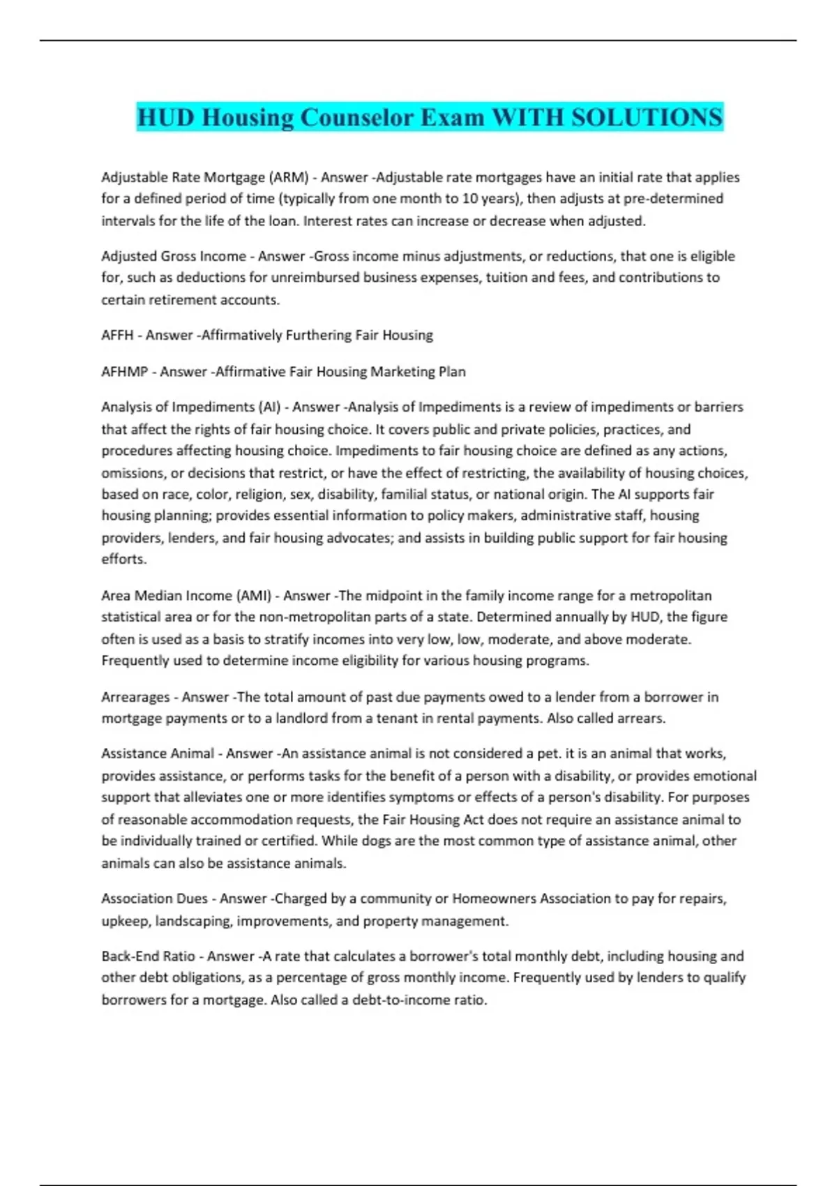 HUD Housing Counselor Exam WITH SOLUTIONS Adjustable Rate Mortgage (ARM) - Answer -Adjustable rate mortgages have an initial rate that applies for a defined period of time (typically from one month to 10 years), then adjusts at pre-determined intervals for the life of the loan. Interest rates can increase or decrease when adjusted. Adjusted Gross Income - Answer -Gross income minus adjustments, or reductions, that one is eligible for, such as deductions for unreimbursed business expenses, tuition and fees, and contributions to certain retirement accounts. AFFH - Answer -Affirmatively Furthering Fair Housing AFHMP - Answer -Affirmative Fair Housing Marketing Plan Analysis of Impediments (AI) - Answer -Analysis of Impediments is a review of impediments or barriers that affect the rights of fair housing choice. It covers public and private policies, practices, and procedures affecting housing choice. Impediments to fair housing choice are defined as any actions, omissions, or decisions that restrict, or have the effect of restricting, the availability of housing choices, based on race, color, religion, sex, disability, familial status, or national origin. The AI supports fair housing planning; provides essential information to policy makers, administrative staff, housing providers, lenders, and fair housing advocates; and assists in building public support for fair housing efforts. Area Median Income (AMI) - Answer -The midpoint in the family income range for a metropolitan statistical area or for the non-metropolitan parts of a state. Determined annually by HUD, the figure often is used as a basis to stratify incomes into very low, low, moderate, and above moderate. Frequently used to determine income eligibility for various housing programs. Arrearages - Answer -The total amount of past due payments owed to a lender from a borrower in mortgage payments or to a landlord from a tenant in rental payments. Also called arrears. Assistance Animal - Answer -An assistance animal is not considered a pet. it is an animal that works, provides assistance, or performs tasks for the benefit of a person with a disability, or provides emotional support that alleviates one or more identifies symptoms or effects of a person's disability. For purposes of reasonable accommodation requests, the Fair Housing Act does not require an assistance animal to be individually trained or certified. While dogs are the most common ty