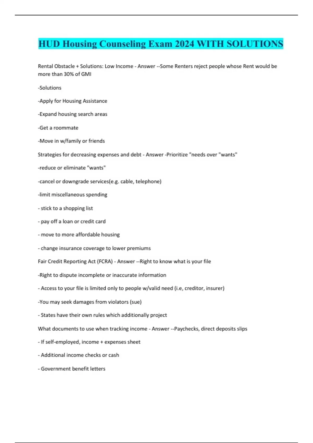 HUD Housing Counseling Exam 2024 WITH SOLUTIONS Rental Obstacle + Solutions: Low Income - Answer --Some Renters reject people whose Rent would be more than 30% of GMI -Solutions -Apply for Housing Assistance -Expand housing search areas -Get a roommate -Move in w/family or friends Strategies for decreasing expenses and debt - Answer -Prioritize "needs over "wants" -reduce or eliminate "wants" -cancel or downgrade services(e.g. cable, telephone) -limit miscellaneous spending - stick to a shopping list - pay off a loan or credit card - move to more affordable housing - change insurance coverage to lower premiums Fair Credit Reporting Act (FCRA) - Answer --Right to know what is your file -Right to dispute incomplete or inaccurate information - Access to your file is limited only to people w/valid need (i.e, creditor, insurer) -You may seek damages from violators (sue) - States have their own rules which additionally project What documents to use when tracking income - Answer --Paychecks, direct deposits slips - If self-employed, income + expenses sheet - Additional income checks or cash - Government benefit letters