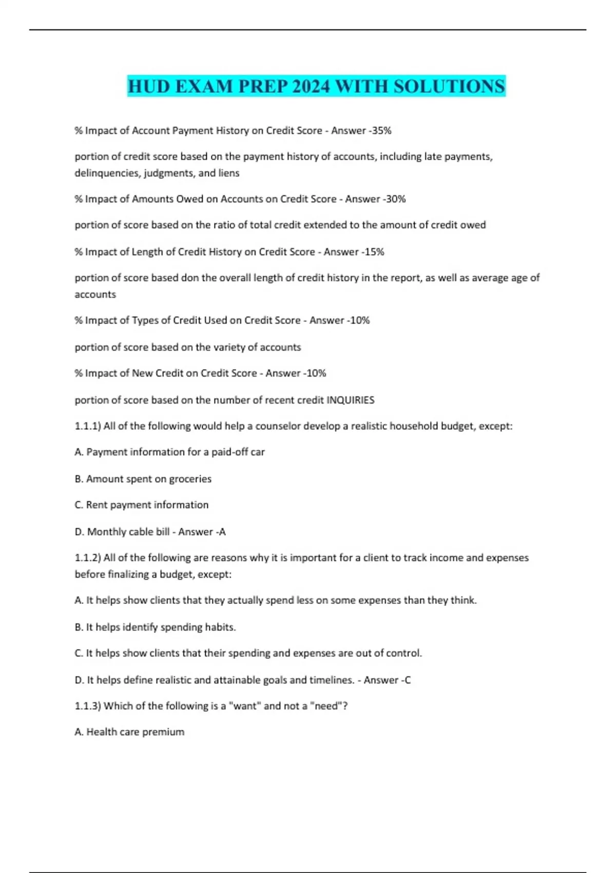 HUD EXAM PREP 2024 WITH SOLUTIONS % Impact of Account Payment History on Credit Score - Answer -35% portion of credit score based on the payment history of accounts, including late payments, delinquencies, judgments, and liens % Impact of Amounts Owed on Accounts on Credit Score - Answer -30% portion of score based on the ratio of total credit extended to the amount of credit owed % Impact of Length of Credit History on Credit Score - Answer -15% portion of score based don the overall length of credit history in the report, as well as average age of accounts % Impact of Types of Credit Used on Credit Score - Answer -10% portion of score based on the variety of accounts % Impact of New Credit on Credit Score - Answer -10% portion of score based on the number of recent credit INQUIRIES 1.1.1) All of the following would help a counselor develop a realistic household budget, except: A. Payment information for a paid-off car B. Amount spent on groceries C. Rent payment information D. Monthly cable bill - Answer -A 1.1.2) All of the following are reasons why it is important for a client to track income and expenses before finalizing a budget, except: A. It helps show clients that they actually spend less on some expenses than they think. B. It helps identify spending habits.
