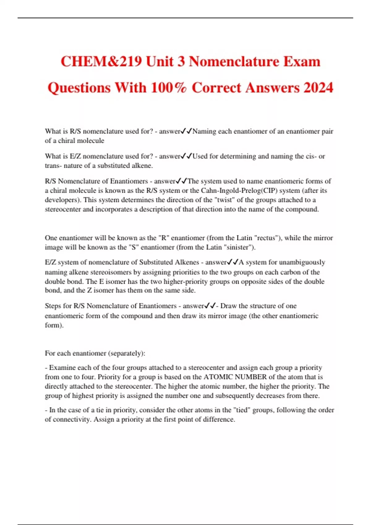 CHEM&219 Unit 3 Nomenclature Exam Questions With 100% Correct Answers 2024 What is R/S nomenclature used for? - answerNaming each enantiomer of an enantiomer pair of a chiral molecule What is E/Z nomenclature used for? - answerUsed for determining and naming the cis- or trans- nature of a substituted alkene. R/S Nomenclature of Enantiomers - answerThe system used to name enantiomeric forms of a chiral molecule is known as the R/S system or the Cahn-Ingold-Prelog(CIP) system (after its developers). This system determines the direction of the "twist" of the groups attached to a stereocenter and incorporates a description of that direction into the name of the compound. One enantiomer will be known as the "R" enantiomer (from the Latin "rectus"), while the mirror image will be known as the "S" enantiomer (from the Latin "sinister"). E/Z system of nomenclature of Substituted Alkenes - answerA system for unambiguously naming alkene stereoisomers by assigning priorities to the two groups on each carbon of the double bond. The E isomer has the two higher-priority groups on opposite sides of the double bond, and the Z isomer has them on the same side. Steps for R/S Nomenclature of Enantiomers - answer- Draw the structure of one enantiomeric form of the compound and then draw its m
