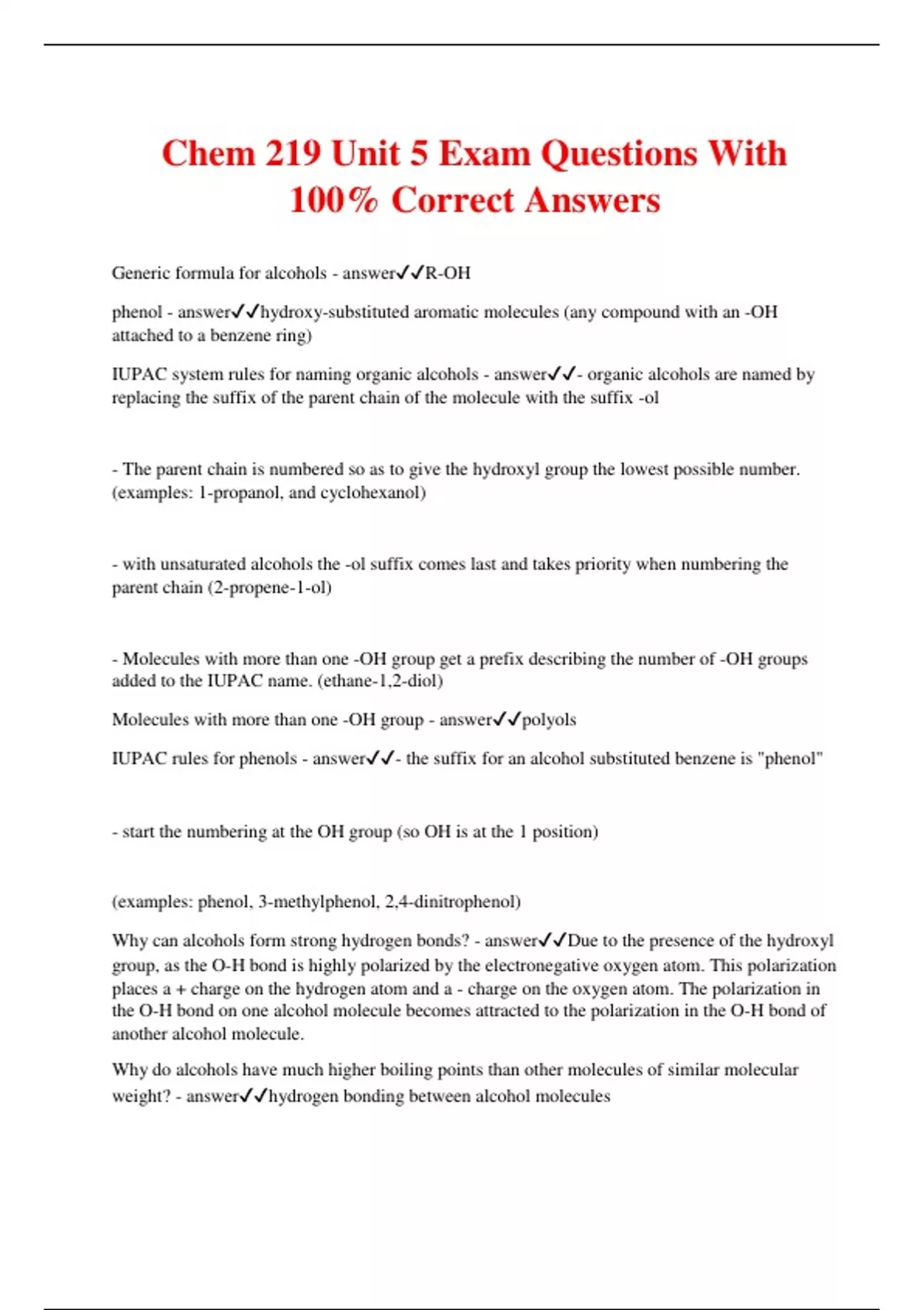 Chem 219 Unit 5 Exam Questions With 100% Correct Answers Generic formula for alcohols - answerR-OH phenol - answerhydroxy-substituted aromatic molecules (any compound with an -OH attached to a benzene ring) IUPAC system rules for naming organic alcohols - answer- organic alcohols are named by replacing the suffix of the parent chain of the molecule with the suffix -ol - The parent chain is numbered so as to give the hydroxyl group the lowest possible number. (examples: 1-propanol, and cyclohexanol) - with unsaturated alcohols the -ol suffix comes last and takes priority when numbering the parent chain (2-propene-1-ol) - Molecules with more than one -OH group get a prefix describing the number of -OH groups added to the IUPAC name. (ethane-1,2-diol) Molecules with more than one -OH group - answerpolyols IUPAC rules for phenols - answer- the suffix for an alcohol substituted benzene is "phenol" - start the numbering at the OH group (so OH is at the 1 position) (examples: phenol, 3-methylphenol, 2,4-dinitrophenol) Why can alcohols form strong hydrogen bonds? - answerDue to the presence of the hydroxyl group, as the O-H bond is highly polarized by the electronegative oxygen atom. This polarization places a + charge on the hydrogen atom and a - charge on the oxygen atom. The polarization in the O-H bond on one alcohol molecule becomes attracted to the polarization in the O-H bond of another alcohol molecule. Why do alcohols have much higher boiling points than other molecules of similar molecular weight? - answerhydrogen bonding between alcohol molecules These attractions raise the amount of energy required to vaporize the liquid-phase molecules (boil), which translates into increased boiling point temperatures. Alcohol molecules can freely hydrogen bond to other molecules possessing what groups? - answerO-H, N-H, or S-H functional groupings How does the water solubility of alcohol molecules change as the molecular weight changes? - answerAlcohol molecules of lower molecular weight are mostly soluble in water as a result of the ability to hydrogen bond to OH, NH, or SH groups. As the molecular weight or carbon- chain length increases, the alcohol molecules become correspondingly less soluble in water. How do alcohols and phenols act as weak acids and weak bases? - answer- acts as an acid by donating the O-H proton as H - acts as a base by accepting H+ using a lone pair on the O atom amphoteric substances - answerSubstances that can act as both acids and bases (alcohols and phenols) Why is acid dissociation for most alcohols unfavorable (lies towards the left)? - answerDissociation produces an alkoxide ion (the conjugate base of an alcohol), which is a very strong base. How can you conduct acid-base reactions that favor the formation of weaker conjugate acids/bases? - answerTo promote (favor) the formation of the alkoxide ion, the alcohol can be treated with sodium or potassium metal (Na or K) or a base that is stronger than the RO- ion produced. protonation of an alcohol - answerWhen alcohols act as weak bases by using a lone pair on the oxygen atom of the hydroxyl group, alcohols can accept a proton when they are placed in an acidic environment. What is the product of the protonation of an alcohol called? - answeralkyloxonium ion What is a Dehydration reaction for alcohols? What happens during a dehydration reaction for alcohols? - answer- A specific type of elimination reaction. In a dehydration reaction, an alcohol molecule will lose H2O to form an alkene. Alcohols undergo a reaction known as dehydration when they are heated with strong mineral acids (like sulfuric or phosphoric). - the alcohol molecule loses the hydroxyl (OH) from one carbon (the α-carbon) and a hydrogen atom (H) from an adjacent (β) carbon. What is the function of an acid during a dehydration reactions? Why does it do what it does? - answerTo protonate the the OH group It does this to make it a better (more stable) leaving group because H2O is a neutral while hydroxide ion is strongly basic. What type of mechanism is a dehydration reaction for a sterically bulky tertiary alcohol? - answerE1 mechanism Steps of a dehydration reaction for a tertiary alcohol - answer- the OH group is pronated (the alcohol acts as a base and accepts a proton from the acid solvent onto its OH group) - the OH group disassociates, forming a carbocation - then water, acting as a base, removes a β-hydrogen to form the alkene. - The net result is that H and OH are removed (eliminated) from the original alcohol substrate. - products: an alkene and H3O+ What type of mechanism is a dehydration reaction for a sterically non-bulky primary alcohol? - answerE2 mechanism Why do primary alcohols dehydrate through the E2 mechanism? - answerBecause these substrates do not form stable carbocation intermediates. Steps of a dehydration reaction for a primary alcohol - answer- hydroxyl (OH) group is pronated by the solvent - a water molecule (from the solvent?) removes a β-hydrogen. - As the β-hydrogen is removed the bond H-C bond is broken and then there is a C=C bond formed between the β-carbon and the α-carbon. - At the same time. the double bond kicks off the H2O molecule from the α-carbon - The net result is that H and OH are removed (eliminated) from the original alcohol substrate. - products: an alkene and H3O+ What is the order of ease of dehydration of alcohol substrates? - answer3° > 2° > 1° Tertiary alcohols require the least harsh reaction conditions (typically 25% aqueous acid and 60- 80°C), whereas 1° alcohols require fully concentrated acid and temperatures approaching 200°C.