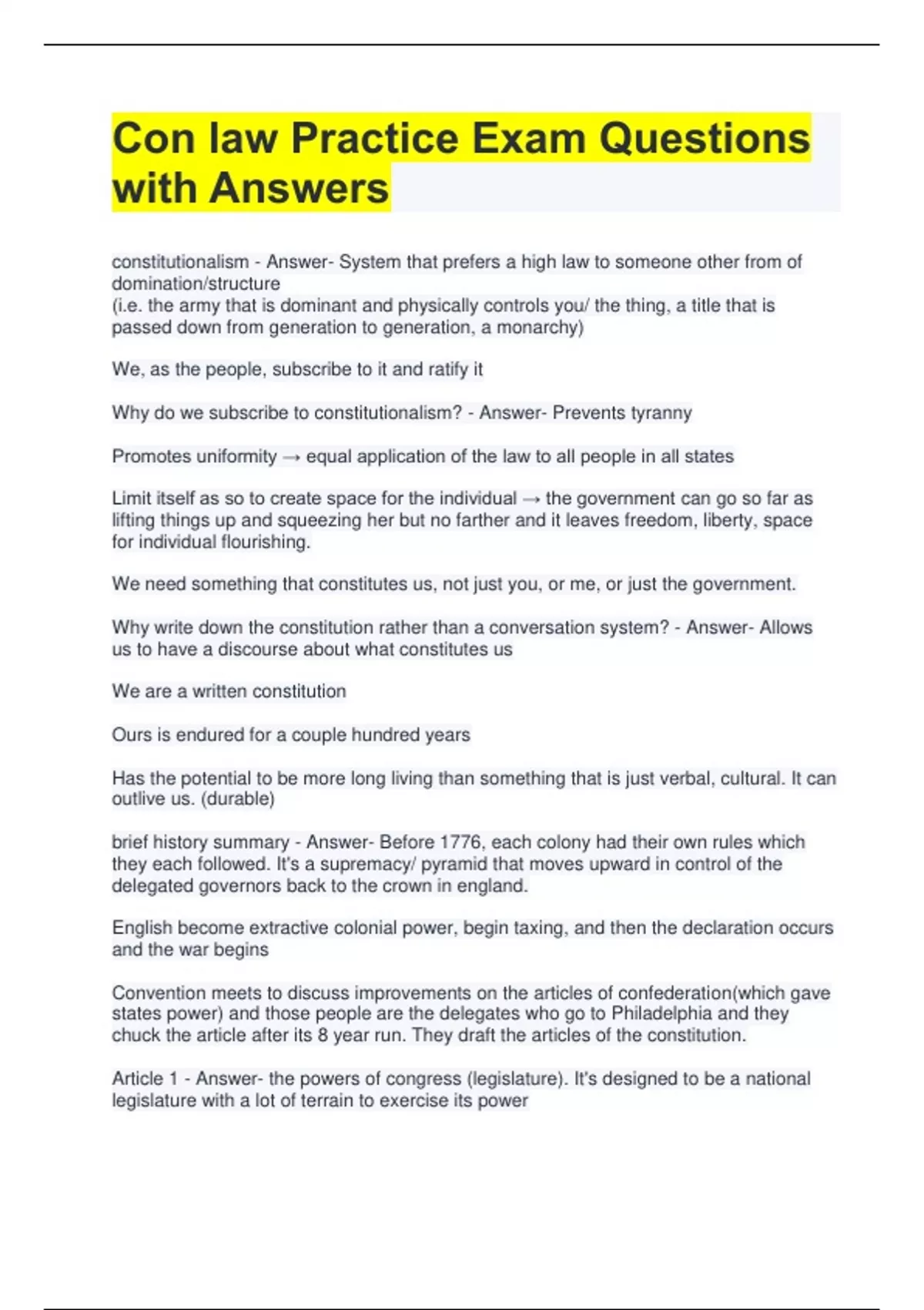 Con law Practice Exam Questions with Answers constitutionalism - Answer- System that prefers a high law to someone other from of domination/structure (i.e. the army that is dominant and physically controls you/ the thing, a title that is passed down from generation to generation, a monarchy) We, as the people, subscribe to it and ratify it Why do we subscribe to constitutionalism? - Answer- Prevents tyranny Promotes uniformity → equal application of the law to all people in all states Limit itself as so to create space for the individual → the government can go so far as lifting things up and squeezing her but no farther and it leaves freedom, liberty, space for individual flourishing. We need something that constitutes us, not just you, or me, or just the government. Why write down the constitution rather than a conversation system? - Answer- Allows us to have a discourse about what constitutes us We are a written constitution Ours is endured for a couple hundred years Has the potential to be more long living than something that is just verbal, cultural. It can outlive us. (durable) brief history summary - Answer- Before 1776, each colony had their own rules which they each followed. It's a supremacy/ pyramid that moves upward in control of the delegated governors back to the crown in england. English become extractive colonial power, begin taxing, and then the declaration occurs and the war begins Convention meets to discuss improvements on the articles of confederation(which gave states power) and those people are the delegates who go to Philadelphia and they chuck the article after its 8 year run. They draft the articles of the constitution. Article 1 - Answer- the powers of congress (legislature). It's designed to be a national legislature with a lot of terrain to exercise its power article 2 - Answer- the president/executive. Charged with prosecution of the law and vested in one person elected by the electoral college Article 3 - Answer- a national judiciary. A judiciary with enumerated powers over particular subject matters. The Supreme court and the legislature will decide how big it will be and if it will have lower courts beneath it. article 4 - Answer- state to state commenty/cooperation/coexistence. What do states owe each other in this new nation that has been created? Respect for each other's unique property arrangements/system. article 5 - Answer- provisions by which this document may be amended. Legislative path where congress opposes and states ratify. Second is the constitutional convention that states and citizens can call for changes. Article 6 - Answer- supremacy principle. The Constitution is the Supreme law of the land. No individual rights provisions Article 7 of the Constitution - Answer- Outlines the process for ratification of the Constitution 14th amendment - Answer- (guarantees equal protection and due process) The 14th amendment was proposed by the reconstruction of congress and ratified by states in 1868. Recognized equal natural citizenship without regard to race, looked at former federacy as a continuing threat to the US. 1st amendment - Answer- protection of free speech, free press, and religion 13th amendment - Answer- prohibit slavery Originalism - Answer- firm believers of original public meaning of the constitution. According to this approach, a provision of the constitution must mean today what is meant when it was adopted. Seeks textualism, original meaning, historical non -originalism - Answer- non-originalists generally believe that the constitution's meaning today is not always the meaning that it had when it was ratified. They look to a range of sources in interpreting the constitution. They conclude that the original meaning of a constitutional provision, expressed at a very high level of generality, provides guidance for ascertaining the relevant constitutional rule. ex: love, let people want who they want to love Decision of the courts (precedent), policy Perpetual arguments for constitutional interpretation - Answer- (1)Textualism→ look back to the text To think about how others have read it→seeks to obtain the original public meaning of constitution (the way the public at that time read it) Scalia - constitution is dead as in locked down in terms of what it meant then, it has been since..What is meant that is what it means now(originalism) (2) Decision of the court (precedent) → controlling/stabilizing force, the power of what is decided stays decided - star decisis. There are many interpretations that have come before us that have consistently marched down the same path. (3)History of the country → maybe it's not irrelevant in thinking of what others have done in thinking what others can do now. Even in the absence of a decision there is still history. (4)Policy → still in the background. It's a form of political participation that becomes self governance. Used as a way to interpret the constitution ARTICLE 3 section 1 - Answer- creates supreme ct. States will continue to exist which have judicial power BUT the judicial power of the US is with the supreme court and inferior courts, if congress chooses to create them. (gives congress power here) also says judges are paid to hold office during good behavior, without lowering their pay (serve for life). Good behavior = how long justices serve which is life article 3 section 2 - Answer- Says what cases/jurisdiction(subject matters like diversity and fed q) the Supreme Court must decide. Divides them into original(litigation began here; federal trial courts) and appellate jurisdiction (case didn't begin there, came from lower court to there; Fed circuit courts). Congress has power to regulate the appellate jurisdiction. It also guarantees trial by jury in criminal court either in that state or where congress directs. Gives a less biased and more neutral court system Maubury v. Madison - Answer- established the Supreme Court's power of judicial review The statute (judiciary act of