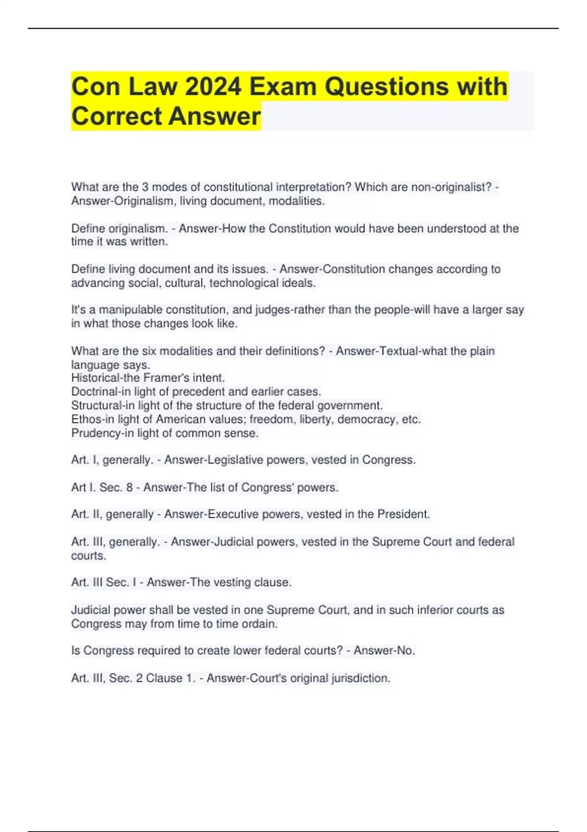 Con Law 2024 Exam Questions with Correct Answer What are the 3 modes of constitutional interpretation? Which are non-originalist? - Answer-Originalism, living document, modalities. Define originalism. - Answer-How the Constitution would have been understood at the time it was written. Define living document and its issues. - Answer-Constitution changes according to advancing social, cultural, technological ideals. It's a manipulable constitution, and judges-rather than the people-will have a larger say in what those changes look like. What are the six modalities and their definitions? - Answer-Textual-what the plain language says. Historical-the Framer's intent. Doctrinal-in light of precedent and earlier cases. Structural-in light of the structure of the federal government. Ethos-in light of American values; freedom, liberty, democracy, etc. Prudency-in light of common sense. Art. I, generally. - Answer-Legislative powers, vested in Congress. Art I. Sec. 8 - Answer-The list of Congress' powers. Art. II, generally - Answer-Executive powers, vested in the President. Art. III, generally. - Answer-Judicial powers, vested in the Supreme Court and federal courts. Art. III Sec. I - Answer-The vesting clause. Judicial power shall be vested in one Supreme Court, and in such inferior courts as Congress may from time to time ordain. Is Congress required to create lower federal courts? - Answer-No. Art. III, Sec. 2 Clause 1. - Answer-Court's original jurisdiction. Judicial power shall extend to all cases [11 categories listed]. What federal jurisdiction do you have if your suit does not fit in any of the elven categories under Art. 3, Sec. 2, Clause 1? - Answer-None. Art 3, Sec 2, Clause 2 - Answer-In all cases affecting ambassadors, public ministers/consuls, and where a State is a party, the US SC has original jurisdiction. In all other cases of federal jurisdiction, the US SC has appellate jurisdiction. Art. 4, generally. - Answer-Interstate issues. Art. 5, generally. - Answer-The amendment process. Art 6, generally. - Answer-Supremacy Clause. Art 7, generally. - Answer-Ratification. Define separation of powers. - Answer-The system of checks and balances that ensure no branch of government can overreach the others. Where in the Constitution is separation of powers outlined? - Answer-Nowhere. No explicit clause. Where is separation of powers implied? - Answer-The vesting clauses. How is the separation of powers implied? - Answer-Through the 10th Amendment. Any power not given in writing is not available to the fed government, so the vesting clauses reserve their powers to their respective branches. Define judicial review. - Answer-The power of the Court to say that a statute is inconsistent with the Constitution, and therefore unenforceable. Where does judicial review get its power? - Answer-The text--the "judicial power" Define, generally, the 3 situations where judicial review applies, and their cases. - Answer-Marbury situation: When a federal law says X, but The Constitution, under the Court's interpretation, says not X. Martin situation: When the Court says X on appeal from a state court, but The State court refuses to enforce X. Cooper situation: When the Court interprets the Constitution to come to a holding in X, but A State court disagrees with the Court's Constitutional interpretation in X. What are the limits on judicial review? - Answer-Political questions Case/controversy requirement Standing Congress's power to control certain aspects of fed. Court jurisdiction