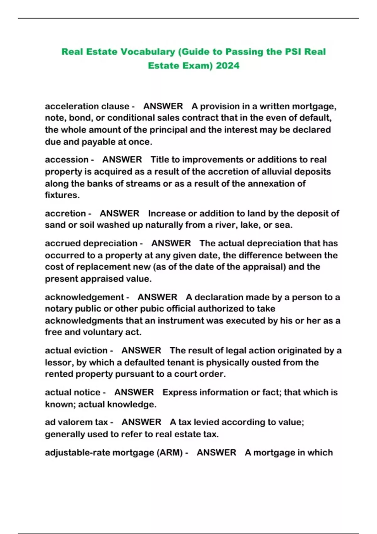 Real Estate Vocabulary (Guide to Passing the PSI Real Estate Exam) 2024...