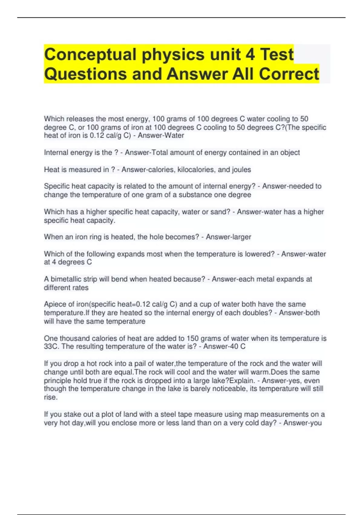 Conceptual physics unit 4 Test Questions and Answer All Correct Which releases the most energy, 100 grams of 100 degrees C water cooling to 50 degree C, or 100 grams of iron at 100 degrees C cooling to 50 degrees C?(The specific heat of iron is 0.12 cal/g C) - Answer-Water Internal energy is the ? - Answer-Total amount of energy contained in an object Heat is measured in ? - Answer-calories, kilocalories, and joules Specific heat capacity is related to the amount of internal energy? - Answer-needed to change the temperature of one gram of a substance one degree Which has a higher specific heat capacity, water or sand? - Answer-water has a higher specific heat capacity. When an iron ring is heated, the hole becomes? - Answer-larger Which of the following expands most when the temperature is lowered? - Answer-water at 4 degrees C A bimetallic strip will bend when heated because? - Answer-each metal expands at different rates Apiece of iron(specific heat=0.12 cal/g C) and a cup of water both have the same temperature.If they are heated so the internal energy of each doubles? - Answer-both will have the same temperature One thousand calories of heat are added to 150 grams of water when its temperature is 33C. The resulting temperature of the water is? - Answer-40 C If you drop a hot rock into a pail of water,the temperature of the rock and the water will change until both are equal.The rock will cool and the water will warm.Does the same principle hold true if the rock is dropped into a large lake?Explain. - Answer-yes, even though the temperature change in the lake is barely noticeable, its temperature will still rise. If you stake out a plot of land with a steel tape measure using map measurements on a very hot day,will you enclose more or less land than on a very cold day? - Answer-you will enclose more land,because the steel in the tape measure expands,so the distance between its marks is greater than when it is cold. Temperature and Kinetic Energy - Answer-Temperature is related to the random motions of the molecules in a substance. It is closely related to the average kinetic energy of translational motion of molecules. Temperature Scales - Answer-The most widely used scale is the Celsius scale. On this scale, water freezes at 0 degrees and boils at 100 degrees. In the U.S., the most common scale is the Fahrenheit scale. On this scale, water freezes as 32 degrees and boils at 212 degrees. The scientific scale, is the Kelvin scale. It begins at the lowest possible temperature, absolute zero, -273 degrees Celsius (-460 degrees Fahrenheit). Heat - Answer-The energy that transfers from one object to another because of a temperature difference between them. The heat unit used in rating foods is a kilocalorie, or 1000 calories, or the heat required to raise the temperature of 1 kg of water by 1 degree Celsius. Specific Heat Capacity - Answer-The quantity of heat required to raise the temperature of a unit mass of a substance 1 degree. Different substances have different capacities for storing internal energy, and absorbed energy can effect substances in different ways. The more molecules move around, the higher their specific heat capacity. Therefore, water molecules have higher specific heat capacity than metals. Specific Heat Capacity Equation Q = mc delta T - Answer-c = specific heat capacity Q = quantity of heat m = mass delta T= triangle T= change in temperature
