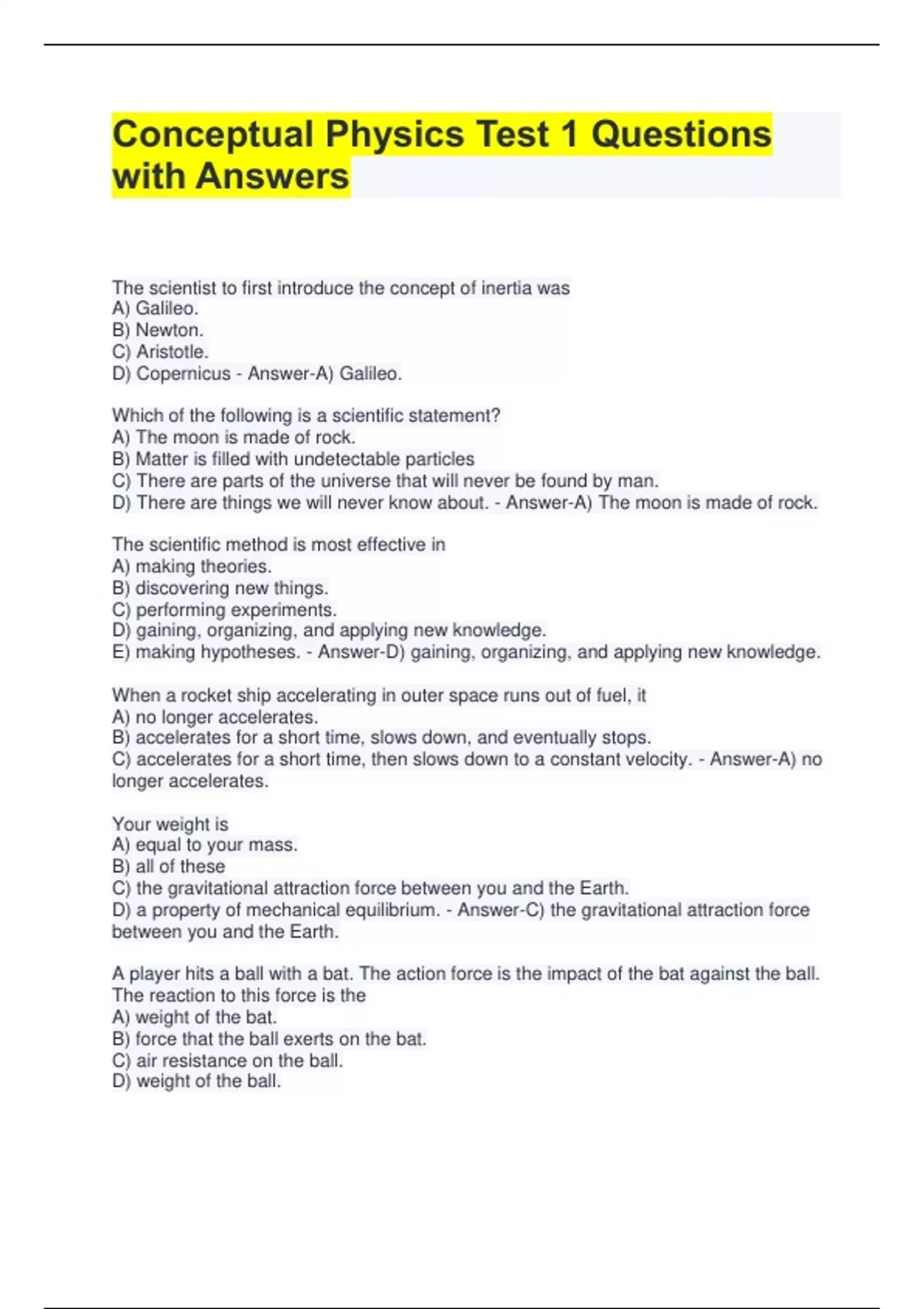 Conceptual Physics Test 1 Questions with Answers The scientist to first introduce the concept of inertia was A) Galileo. B) Newton. C) Aristotle. D) Copernicus - Answer-A) Galileo. Which of the following is a scientific statement? A) The moon is made of rock. B) Matter is filled with undetectable particles C) There are parts of the universe that will never be found by man. D) There are things we will never know about. - Answer-A) The moon is made of rock. The scientific method is most effective in A) making theories. B) discovering new things. C) performing experiments. D) gaining, organizing, and applying new knowledge. E) making hypotheses. - Answer-D) gaining, organizing, and applying new knowledge. When a rocket ship accelerating in outer space runs out of fuel, it A) no longer accelerates. B) accelerates for a short time, slows down, and eventually stops. C) accelerates for a short time, then slows down to a constant velocity. - Answer-A) no longer accelerates. Your weight is A) equal to your mass. B) all of these C) the gravitational attraction force between you and the Earth. D) a property of mechanical equilibrium. - Answer-C) the gravitational attraction force between you and the Earth. A player hits a ball with a bat. The action force is the impact of the bat against the ball. The reaction to this force is the A) weight of the bat. B) force that the ball exerts on the bat. C) air resistance on the ball. D) weight of the ball. E) grip of the player's hand against the ball. - Answer-B) force that the ball exerts on the bat. Compared to a 1-kg block of solid iron, a 2-kg block of solid iron has twice as much A) volume. B) inertia C) all of these D) none of these E) mass. - Answer-C) all of these In science, theories A) mean very little B) are more important than facts C) are absolute D) may change - Answer-D) may change A ball tossed vertically upward rises, reaches its highest point, and then falls back to its starting point. During this time the acceleration of the ball is always A) directed upward. B) in the direction of motion. C) opposite its velocity. D) directed downward. - Answer-B) in the direction of motion. An object is pulled northward by a force of 10 N and at the same time another force of 15 N pulls it southward. The magnitude of the resultant force on the object is A) 25 N. B) 5 N. C) 150 N. D) 0 N. - Answer-B) 5 N. A ride on a roller-coaster car containing 6 passengers takes 3 minutes. Neglecting friction, a similar ride with 12 passengers aboard would take A) 3 minutes. B) 12 minutes. C) 1.5 minutes. D) 6 minutes. - Answer-A) 3 minutes. If no external forces are acting on a moving object, it will A) move slower and slower until it finally stops. B) continue moving at the same velocity. C) continue moving at the same speed. - Answer-B) continue moving at the same velocity. A truck is moving at constant velocity. Inside the storage compartment, a rock is dropped from the midpoint of the ceiling and strikes the floor below. The rock hits the floor A) exactly below the midpoint of the ceiling. B) ahead of the midpoint of the ceiling. C) More information is needed to solve this problem. D) behind the midpoint of the ceiling. - Answer-A) exactly below the midpoint of the ceiling.