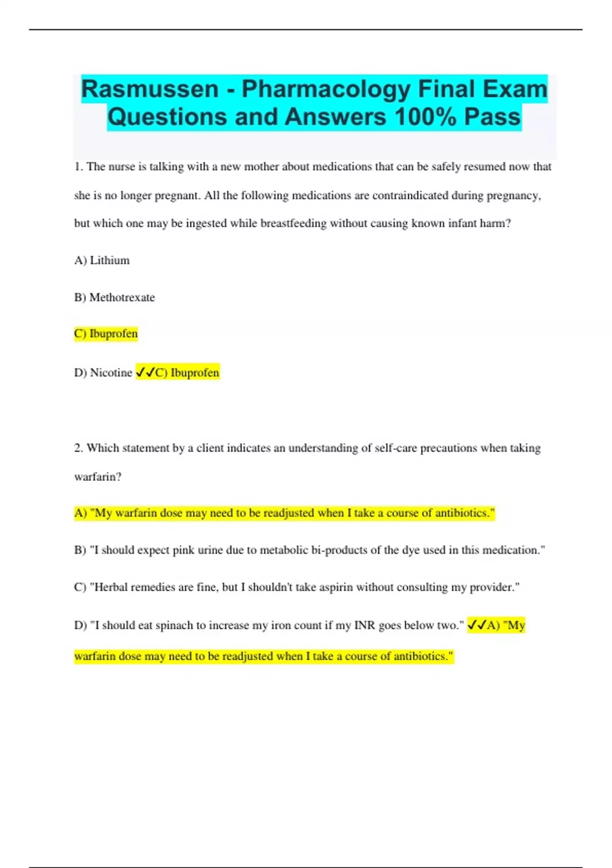 Rasmussen - Pharmacology Final Exam Questions and Answers 100% Pass 1. The nurse is talking with a new mother about medications that can be safely resumed now that she is no longer pregnant. All the following medications are contraindicated during pregnancy, but which one may be ingested while breastfeeding without causing known infant harm? A) Lithium B) Methotrexate C) Ibuprofen D) Nicotine C) Ibuprofen 2. Which statement by a client indicates an understanding of self-care precautions when taking warfarin? A) "My warfarin dose may need to be readjusted when I take a course of antibiotics." B) "I should expect pink urine due to metabolic bi-products of the dye used in this medication." C) "Herbal remedies are fine, but I shouldn't take aspirin without consulting my provider." D) "I should eat spinach to increase my iron count if my INR goes below two." A) "My warfarin dose may need to be readjusted when I take a course of antibiotics." 3. Male client tells the nurse he awakens once or twice each night to video and has difficulty starting his stream of urine. He describes these symptoms as " annoying." The client provider examines him and notes that the prostate is moderately enlarged. The client is sexually active and tells the nurse that he doesn't want to take any medication that will interfere with sexual function. THe nurse anticipates the provider will order which of the following? A) Silodosin B) A transurethral prostatectomy C) Finasteride D) Doxazosin D) Doxazosin 4.A 50-year-old postmenopausal cleint who has had a hysterectomy has moderate to severe hot flashes and is discussing estrogen therapy with the nurse. What will the nurse tell the client regarding the side effect of estrogen therapy? A) An estrogen progesterone product will increase side effects B) Transdermal preparations of estrogen therapy have reduced side effects. C) Side effects of estrogen therapy are uncommon among women of her age. D) An intravaginal preparation may be best. B) Transdermal preparations of estrogen therapy have reduced side effects. 5. A Client has an infection caused by pseudomonas aeruginosa, and the prescriber has ordered intravenous piperacillin and tobramycin. Why might the nurse question this combination of antibiotics? A) This combination causes tendon rupture. B) Aminoglycosides are inactivated by penicillins. C) Aminoglycosides alone are adequate against pseudomonas. There is no need to risk penicillin allergy. D) Aminoglycosides increase the risk of penicillin allergy. B) Aminoglycosides are inactivated by penicillins. 6. A client with bronchitis is taking trimethoprim/sulfamethoxazole 160/800 mg orally, twice daily. Before administering the third dose, the nurse observes the client has a widespread rash, a temperature and a heart rate of 100 beats/min. The client looks ill and reports not feeling well. What is the nurse's response? A) Request an order for intravenous trimethoprim/ sulfamethoxazole. B) Initiate probiotics. C) Withhold the treatment and notify the provider of the symptoms. D) Administer the dose and request an order for an antipyretic medication. C) Withhold the treatment and notify the provider of the symptoms. 7. A client with cancer has been taking an opioid analgesic four times daily for chronic pain and reports needing increased doses for pain. What will the nurse tell the client? A- Over time, people can develop tolerance to opioids.