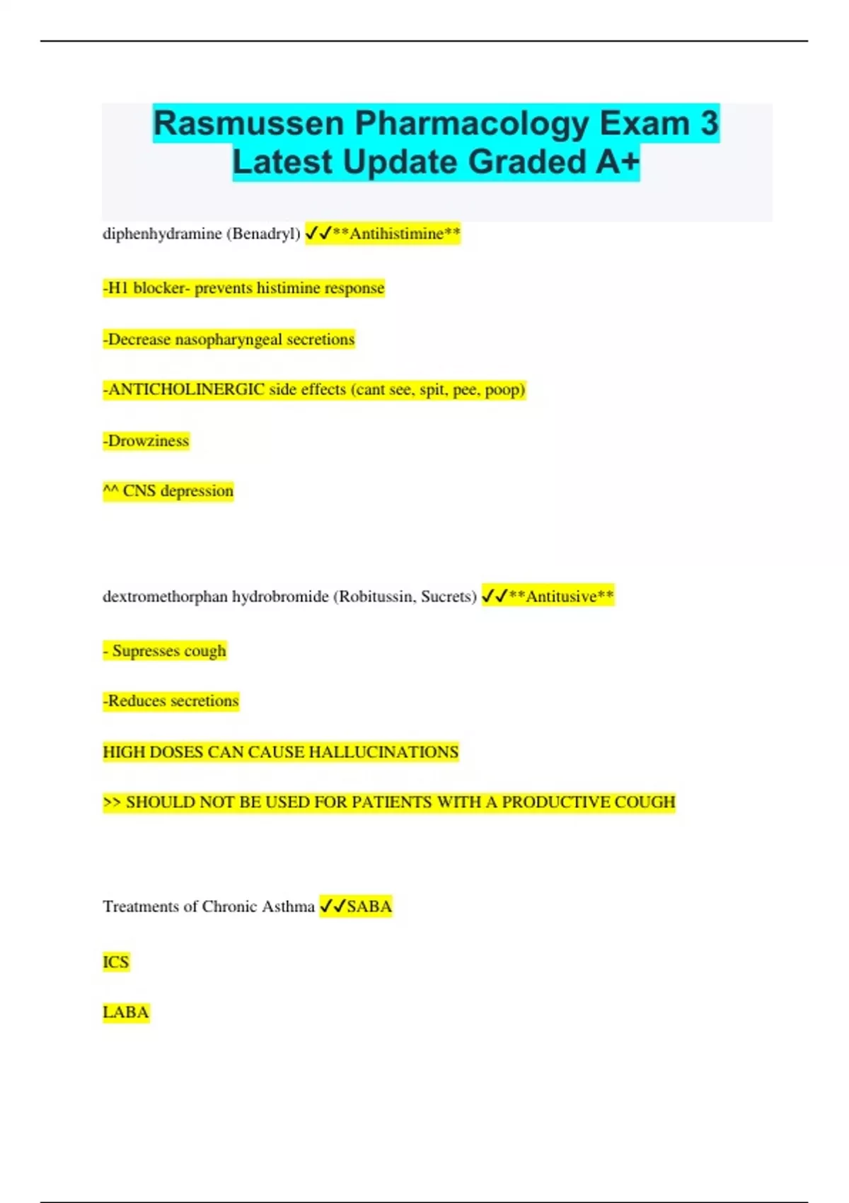 Rasmussen Pharmacology Exam 3 Latest Update Graded A+ diphenhydramine (Benadryl) **Antihistimine** -H1 blocker- prevents histimine response -Decrease nasopharyngeal secretions -ANTICHOLINERGIC side effects (cant see, spit, pee, poop) -Drowziness ^^ CNS depression dextromethorphan hydrobromide (Robitussin, Sucrets) **Antitusive** - Supresses cough -Reduces secretions HIGH DOSES CAN CAUSE HALLUCINATIONS >> SHOULD NOT BE USED FOR PATIENTS WITH A PRODUCTIVE COUGH Treatments of Chronic Asthma SABA ICS LABA Fluticasone/Salmeterol(ADVAIR) SABA Short acting beta agonist or ALBUTEROL ***Quick relief ONLY *** ICS Inhaled corticosteroid or FLUTICASONE LABA Long acting beta agonist or SALEMETEROL what is ADVAIR? **Fluticasone (ICS)** decreases inflammation THINK immune suppression can cause thrush rinse mouth with water thoroughly and spit out do not swallow **salemeterol LABA** prophylaxis and maintenance therapy NOT FOR RESCUE NOT FOR MONOTHERAPY can use in COPD ---causes headache & Dizziness Why should an asthma patient never just be on a LABA? ^^ Mortality Risk inflammation builds up, LABA masks signs and patient dies from asthma attack albuterol (SABA) * short acting beta agonist* causes bronchodialation can ^^ BP and Pulse RESCUE ONLY Side effects: nervousness, restlessness, tremor, chest pains, palpitation what type of side effects would you expect to see after administration of ipratropium bromide? ANTICHOLINERGIC montelukast (Singulair) **Leukotriene inhibitiors** anti-inflammatory effects used for prophylaxis and maintenance NOT FOR RESCUE causes headache, insomnia, irritability, restlessness, tremor, weakness Theophylline **Methylxanthine Derivatives** stimulates CNS and respiration dialates coronary and pulmonary vessels causes tachycardia NARROW THERAPUTIC WINDOW- potential for severe adverse reactions your patient has pneumonia and wants to know why the provider won't prescribe codeine or dexomethorphan (robitussin) like she has gotten in the past. What should you teach her? cough suppressants are best used for short-term NON