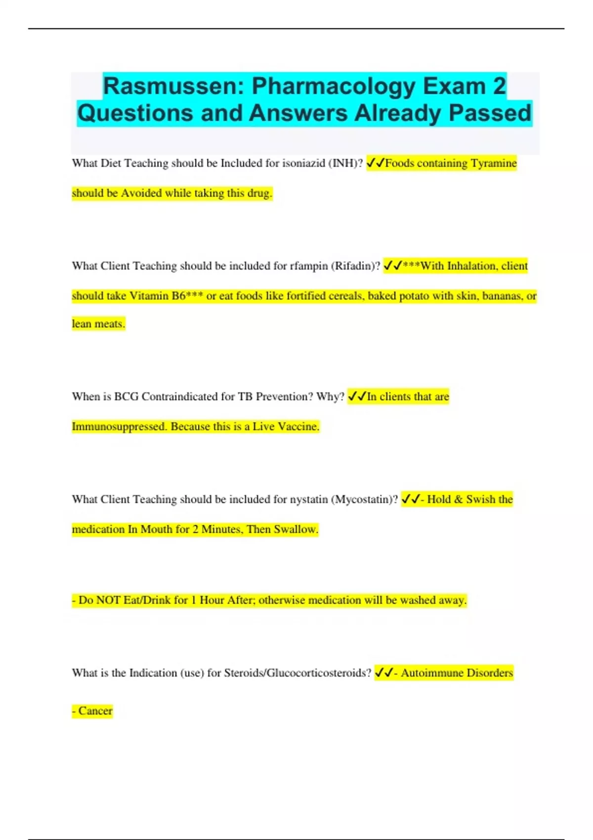Rasmussen: Pharmacology Exam 2 Questions and Answers Already Passed What Diet Teaching should be Included for isoniazid (INH)? Foods containing Tyramine should be Avoided while taking this drug. What Client Teaching should be included for rfampin (Rifadin)? ***With Inhalation, client should take Vitamin B6*** or eat foods like fortified cereals, baked potato with skin, bananas, or lean meats. When is BCG Contraindicated for TB Prevention? Why? In clients that are Immunosuppressed. Because this is a Live Vaccine. What Client Teaching should be included for nystatin (Mycostatin)? - Hold & Swish the medication In Mouth for 2 Minutes, Then Swallow. - Do NOT Eat/Drink for 1 Hour After; otherwise medication will be washed away. What is the Indication (use) for Steroids/Glucocorticosteroids? - Autoimmune Disorders - Cancer - Respiratory Disorders - Edema What Client Teaching should be included for Steroids/Glucocorticosteroids? - Can Cause Insomnia - Take on a FULL STOMACH - DO NOT Stop Taking Abruptly Why should Steroid Not be Stopped Abruptly? Increases Risk of Addison's Disease What is the Indication (use) for ? - Suppression of Pituitary - Osteoporosis or Fractures - Cushing's Syndrome - Hyperglycemia - Increased Bleeding - Hypertension, Tachycardia What Interaction will occur between Steroids/Glucocorticosteroids and NSAIDS or Aspirin? GI Irritation What Analgesics (pain relievers) should be Avoided When Taking Steroids/Glucocorticosteroids? NSAIDS and Aspirin (ASA) Define "Addison's Syndrome". Adrenal Insufficiency. What can Addison's Syndrome Lead To? - Adrenal Shut Down - Adrenal Crisis - Decreased Sodium - LOC Change What is the Indication for Desmopressin? Treatment of Diabetes Insipidus caused by a Deficiency of Vasopressin? What are the Nursing Considerations/Interventions for Desmopressin? - Monitor Daily Weights, LOC Changes, and I&O