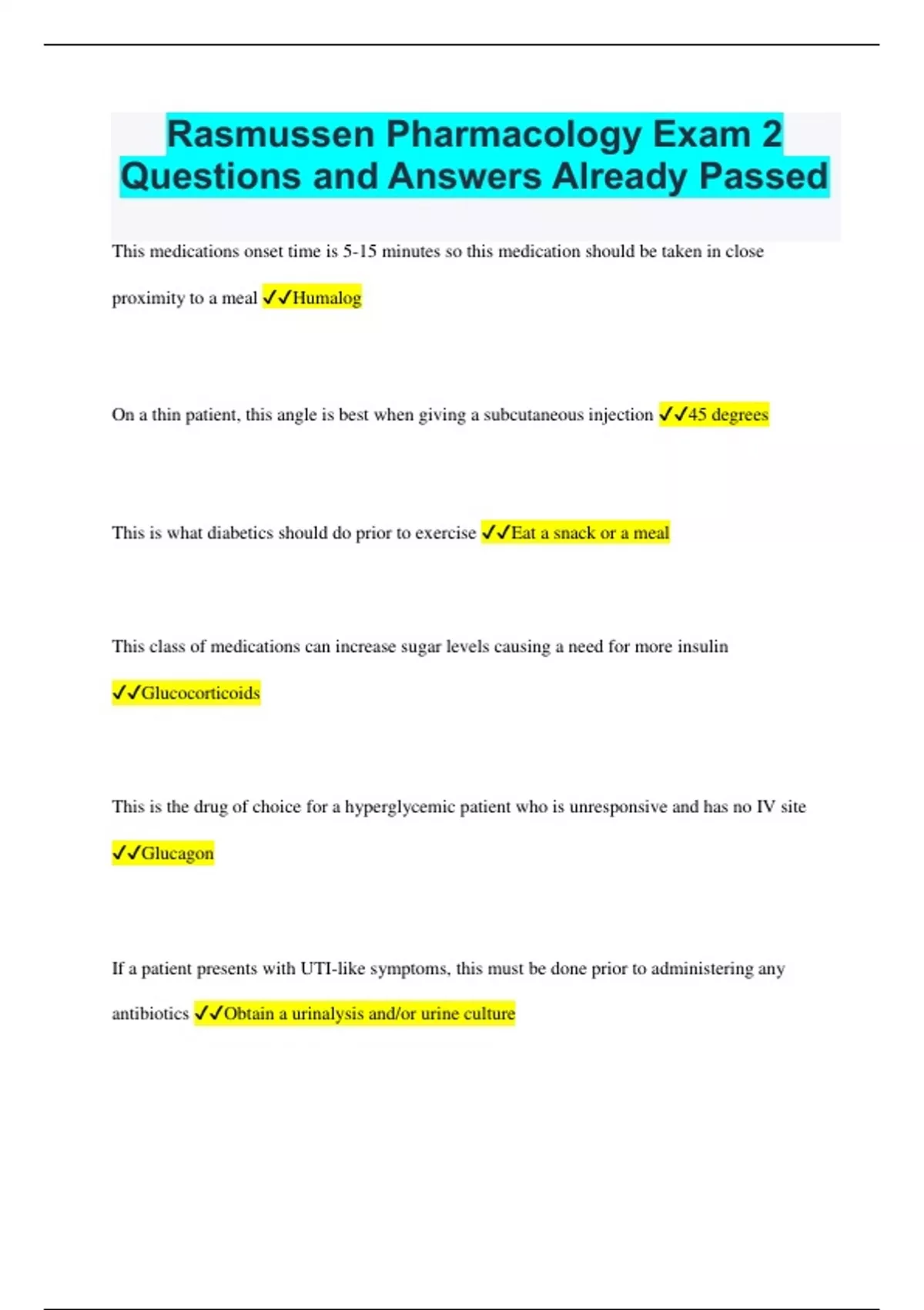 Rasmussen Pharmacology Exam 2 Questions and Answers Already Passed This medications onset time is 5-15 minutes so this medication should be taken in close proximity to a meal Humalog On a thin patient, this angle is best when giving a subcutaneous injection 45 degrees This is what diabetics should do prior to exercise Eat a snack or a meal This class of medications can increase sugar levels causing a need for more insulin Glucocorticoids This is the drug of choice for a hyperglycemic patient who is unresponsive and has no IV site Glucagon If a patient presents with UTI-like symptoms, this must be done prior to administering any antibiotics Obtain a urinalysis and/or urine culture These are the routes of administration for glucagon Subcutaneous, IM, and IV Stopping the administration of this drug class abruptly can cause Addison's disease Glucocorticoids Smoking, age (35 and older), uterine cancer, pregnancy, and a history of DVT are all contrainindications for this class of medication Hormonal contraceptives Administration of this hormone medication should be first thing in the morning and on an empty stomach Levothyroxine For children under 8 years of age, teeth discoloration is a common side effect of this drug Tetracycline Steroids, diphenhydramine, and epinephrine can be given to reduce the symptoms of this Allergic reaction This class of antibiotics when mixed with alcohol can cause a disulfiram reaction Cephalosporins Azithromycin falls into this class of antibiotics Macrolides A compromised immune system and antibiotic use can put patients at risk for developing this Super infection Antitubercular medications can cause these lab values to be elevated Liver function tests (LFTs) Red-pink urine, elevate temperature, and elevated kidney function tests can be caused by this Urinary tract infection Elevated serum uric acid and WBCs are expected in this disease process Gout This class of antibiotics is associated with hepatotoxicity, so liver function must be closely monitored Macrolides