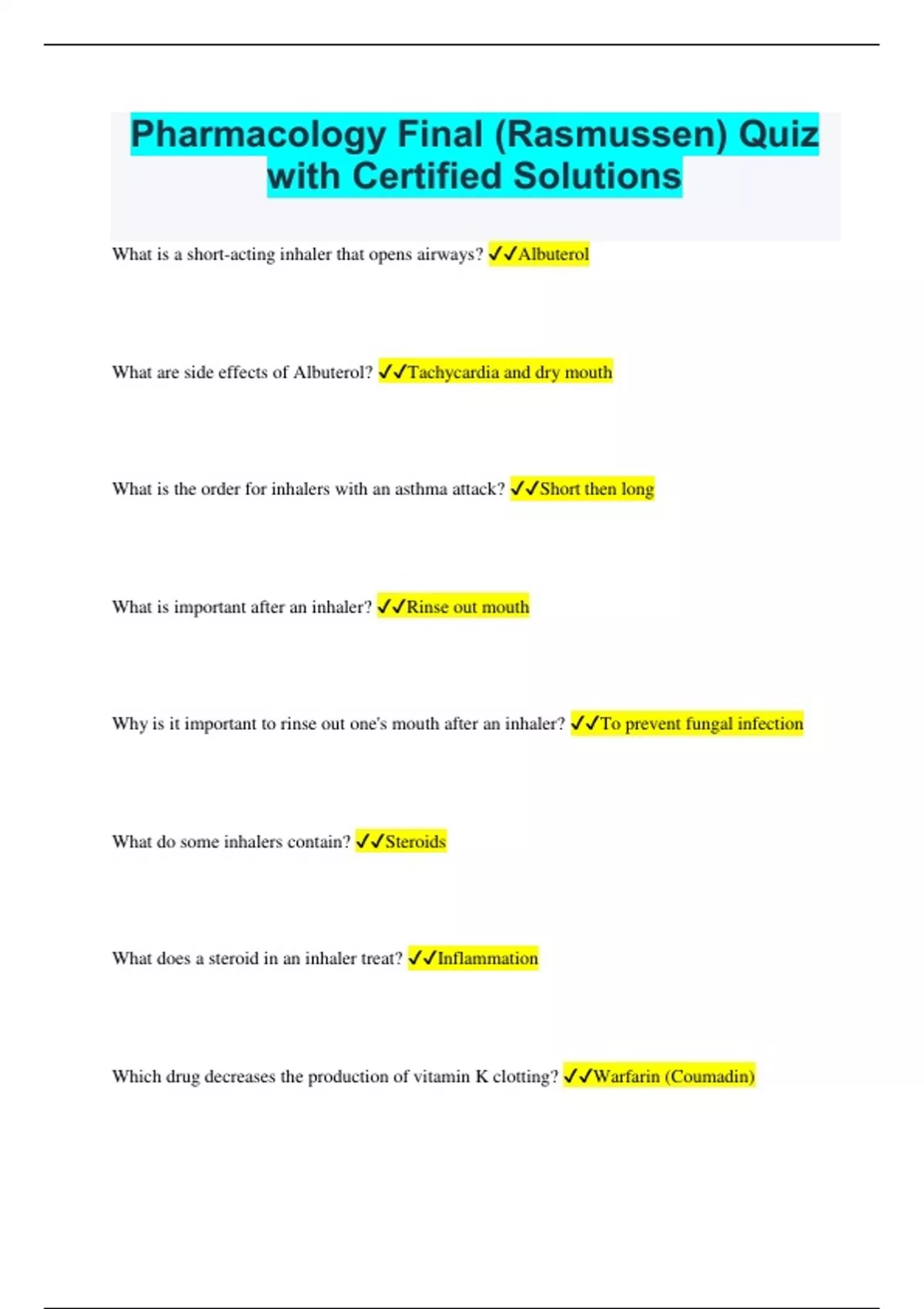 Pharmacology Final (Rasmussen) Quiz with Certified Solutions