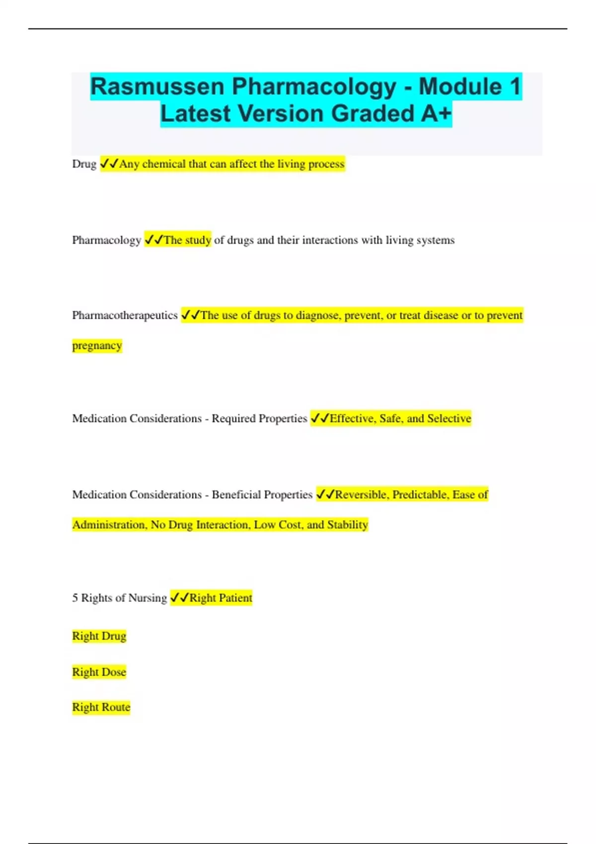 Rasmussen Pharmacology - Module 1 Latest Version Graded A+ Drug Any chemical that can affect the living process Pharmacology The study of drugs and their interactions with living systems Pharmacotherapeutics The use of drugs to diagnose, prevent, or treat disease or to prevent pregnancy Medication Considerations - Required Properties Effective, Safe, and Selective Medication Considerations - Beneficial Properties Reversible, Predictable, Ease of Administration, No Drug Interaction, Low Cost, and Stability 5 Rights of Nursing Right Patient Right Drug Right Dose Right Route Right Time Additional 5 Rights of Nursing Right Assessment Right Documentation Right Evaluation Patient's Right to Education Patient's Right to Refuse What are the 5 steps of the Nursing Process? Assessment Diagnosis Planning Implementation Evaluation What is subjective data? Data that only the subject or "patient" can feel and will tell you. Usually in a statement. What is objective data? Observations or measurements of a patient's health status What is a nursing diagnosis? clinical judgement about the patient in response to an actual or potential health problem What is the purpose of the "Planning Stage" in the Nursing Process? Make SMART Goals What is a SMART Goal? Specific Measurable Attainable Relevant Timely