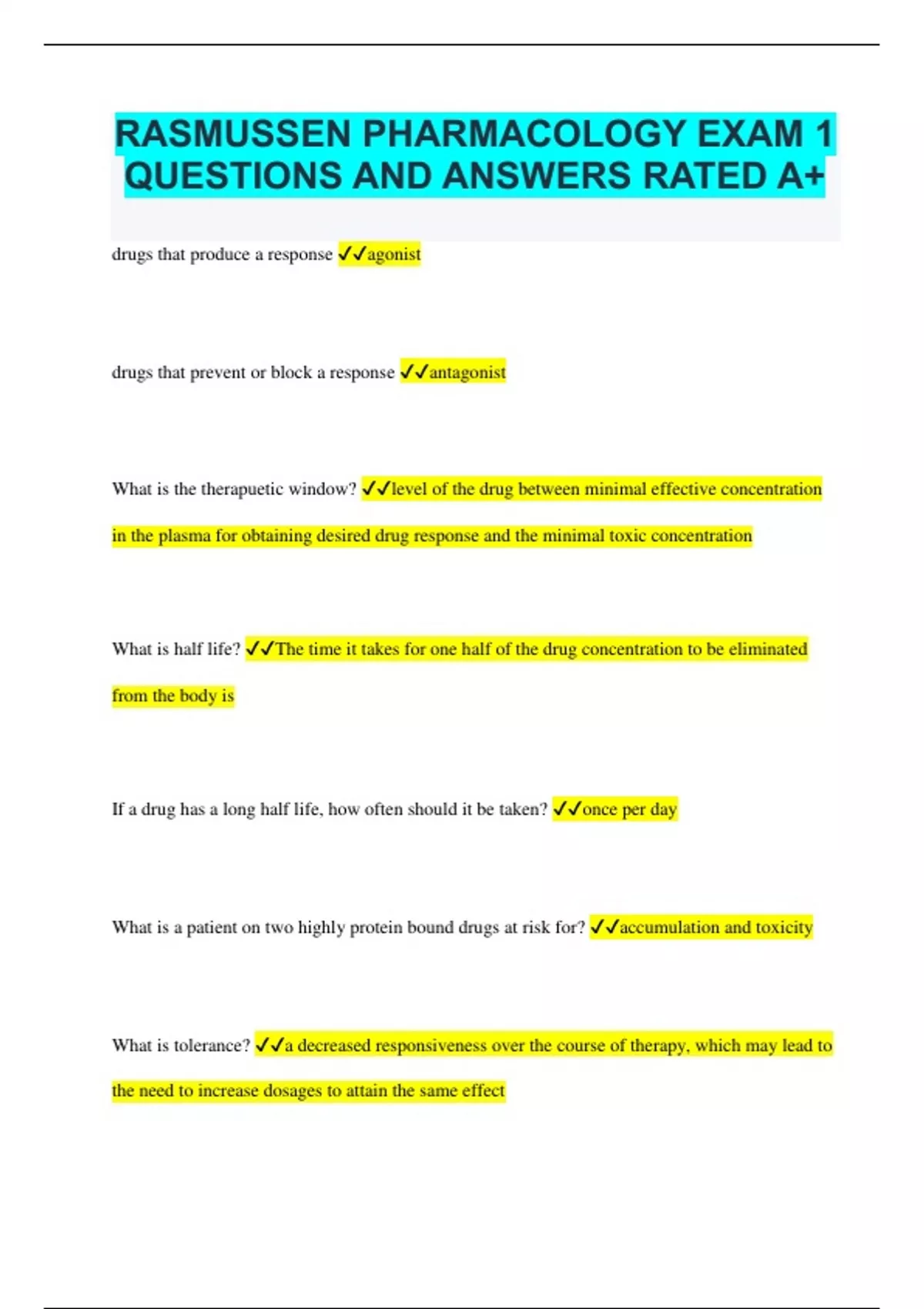 RASMUSSEN PHARMACOLOGY EXAM 1 QUESTIONS AND ANSWERS RATED A+