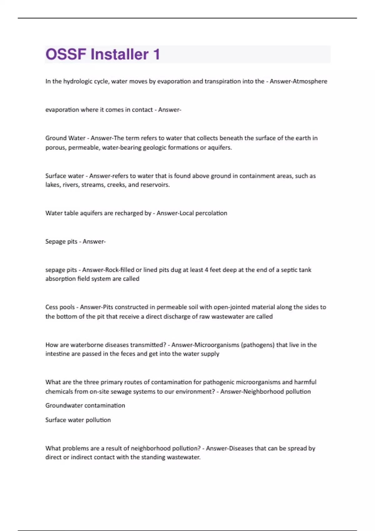 In the hydrologic cycle, water moves by evaporation and transpiration into the - Answer-Atmosphere evaporation where it comes in contact - AnswerGround Water - Answer-The term refers to water that collects beneath the surface of the earth in porous, permeable, water-bearing geologic formations or aquifers. Surface water - Answer-refers to water that is found above ground in containment areas, such as lakes, rivers, streams, creeks, and reservoirs. Water table aquifers are recharged by - Answer-Local percolation Sepage pits - Answersepage pits - Answer-Rock-filled or lined pits dug at least 4 feet deep at the end of a septic tank absorption field system are called Cess pools - Answer-Pits constructed in permeable soil with open-jointed material along the sides to the bottom of the pit that receive a direct discharge of raw wastewater are called How are waterborne diseases transmitted? - Answer-Microorganisms (pathogens) that live in the intestine are passed in the feces and get into the water supply What are the three primary routes of contamination for pathogenic microorganisms and harmful chemicals from on-site sewage systems to our environment? - Answer-Neighborhood pollution Groundwater contamination Surface water pollution What problems are a result of neighborhood pollution? - Answer-Diseases that can be spread by direct or indirect contact with the standing wastewater.Vectors, such as roaches and flies, that can also spread diseases after coming in contact with the wastewater. Unsightly and unpleasant living conditions that result from the standing wastewater and odors. Feuds and bad relationships between neighbors that can result from the wastewater problems. Property values drop and real estate transactions fall through. No one benefits and everyone suffers when neighborhoods are fouled by wastewater. Why is acceptable quality water vital? - Answer-No resource in Texas or elsewhere is more valuable than water. Acceptable quality water is not only vital in sustaining human life, but is also vital in sustaining the natural environment and the economic life of Texas. Ground water that is obtained via a well can be used for - Answer-Drinking, industrial, or agricultural Water table aquifer vs artesian - Answer-Water table aquifer - direct contact with either soil or the intermediate belt Artesian aquifer - overlaid by a layer of impervious material that recieves little or no recharge throigh this confining layer Static water level - Answer-Level at which water stands in a well Two categories of sources of pollutants in surface water - Answer-Point source pollution Nonpoint source pollution Point source vs non point pollution - Answer-Point source comes from specific locations through discharge structures (pipes or ditches). Can be monitored, controlled, and inspected Nonpoint source is intermittent, dispersed flow that escapes from pollution sources with little or no control Groundwater quality is recognized as a minor problem in Texas. - Answer-FalseCesspools and seepage pits are legal systems in Texas and may be installed. - Answer-False Bore holes and injection wells are legal in Texas and may be installed. - Answer-False Artesian aquifers can be contaminated by bore holes and injection wells. - Answer-True In America, laws can be successfully enforced only when the majority of citizens voluntarily comply. - Answer-True Homeowners should be educated the need for and importance of maintaining their OSSF system. - Answer-True On-site sewage facilities (OSSF) have been regulated statewide since - Answer-Sept I 1989 The state agency responsible for regulating OSSF systems is - Answer-TCEQ
