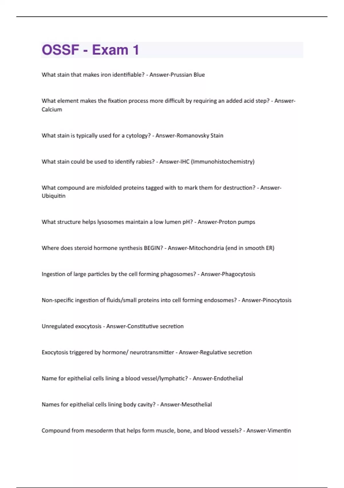 What stain that makes iron identifiable? - Answer-Prussian Blue What element makes the fixation process more difficult by requiring an added acid step? - AnswerCalcium What stain is typically used for a cytology? - Answer-Romanovsky Stain What stain could be used to identify rabies? - Answer-IHC (Immunohistochemistry) What compound are misfolded proteins tagged with to mark them for destruction? - AnswerUbiquitin What structure helps lysosomes maintain a low lumen pH? - Answer-Proton pumps Where does steroid hormone synthesis BEGIN? - Answer-Mitochondria (end in smooth ER) Ingestion of large particles by the cell forming phagosomes? - Answer-Phagocytosis Non-specific ingestion of fluids/small proteins into cell forming endosomes? - Answer-Pinocytosis Unregulated exocytosis - Answer-Constitutive secretion Exocytosis triggered by hormone/ neurotransmitter - Answer-Regulative secretion Name for epithelial cells lining a blood vessel/lymphatic? - Answer-Endothelial Names for epithelial cells lining body cavity? - Answer-Mesothelial Compound from mesoderm that helps form muscle, bone, and blood vessels? - Answer-VimentinCompound from ectoderm and endoderm that helps form intermediate filaments? - AnswerCytokeratin 3 parts of the tunica mucosa - Answer-Lamina epithelial mucosae, Lamina propria mucosae, lamina muscularis mucosae What tissue is the tunica submucosa composed of? - Answer-connective tissue