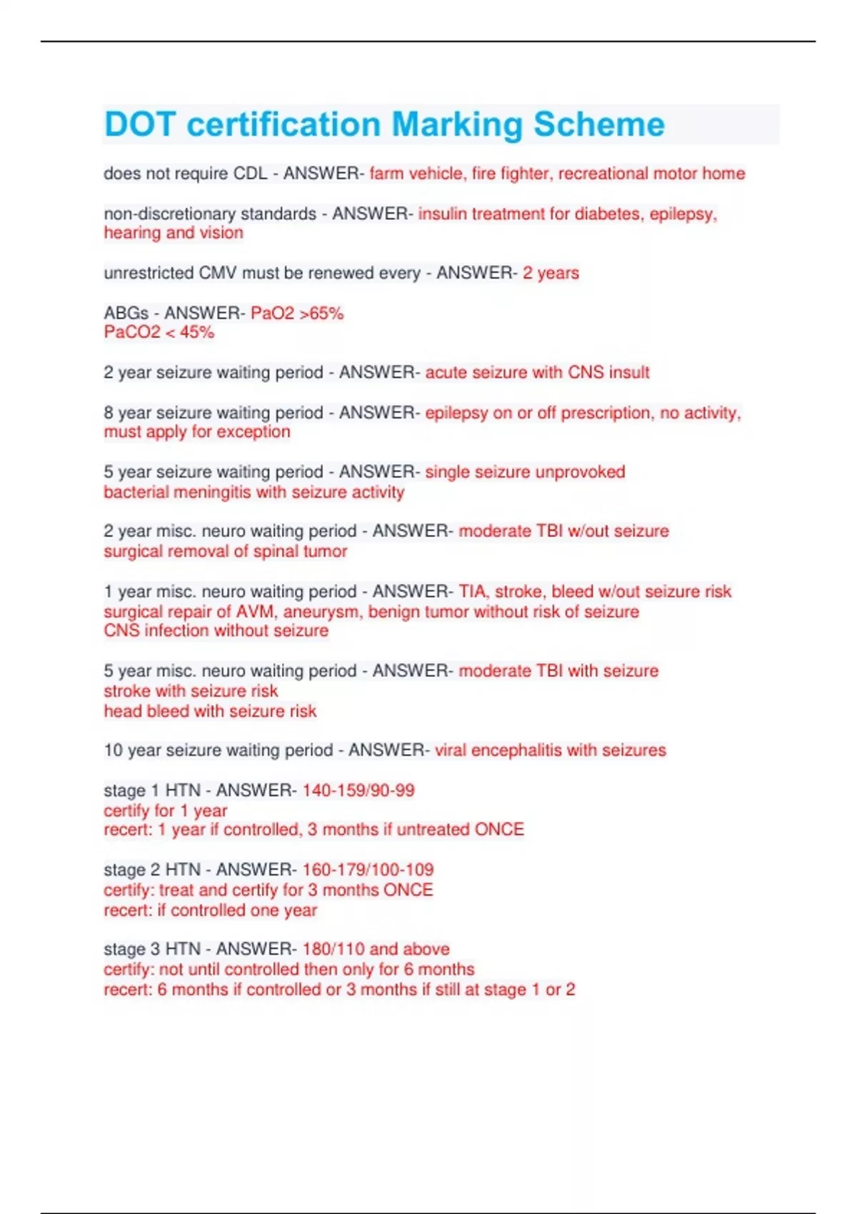 DOT certification Marking Scheme does not require CDL - ANSWER- farm vehicle, fire fighter, recreational motor home non-discretionary standards - ANSWER- insulin treatment for diabetes, epilepsy, hearing and vision unrestricted CMV must be renewed every - ANSWER- 2 years ABGs - ANSWER- PaO2 >65% PaCO2 < 45% 2 year seizure waiting period - ANSWER- acute seizure with CNS insult 8 year seizure waiting period - ANSWER- epilepsy on or off prescription, no activity, must apply for exception 5 year seizure waiting period - ANSWER- single seizure unprovoked bacterial meningitis with seizure activity 2 year misc. neuro waiting period - ANSWER- moderate TBI w/out seizure surgical removal of spinal tumor 1 year misc. neuro waiting period - ANSWER- TIA, stroke, bleed w/out seizure risk surgical repair of AVM, aneurysm, benign tumor without risk of seizure CNS infection without seizure 5 year misc. neuro waiting period - ANSWER- moderate TBI with seizure stroke with seizure risk head bleed with seizure risk 10 year seizure waiting period - ANSWER- viral encephalitis with seizures stage 1 HTN - ANSWER- 140-159/90-99 certify for 1 year recert: 1 year if controlled, 3 months if untreated ONCE stage 2 HTN - ANSWER- 160-179/100-109 certify: treat and certify for 3 months ONCE recert: if controlled one year stage 3 HTN - ANSWER- 180/110 and above certify: not until controlled then only for 6 months recert: 6 months if controlled or 3 months if still at stage 1 or 2 secondary HTN - ANSWER- hyperaldosteronism, pheochromocytoma, renal disease wait 3 months then can certify for 1 year CVD disqualifiers - ANSWER- unable angina, syncope, ischemia on EKG, EF < 40%, unable to tolerate ETT, cardiomyopathy, pulmonary HTN, untreated valve or vascular condition, ICD, or on coumadin that is not monitored or not therapeutic
