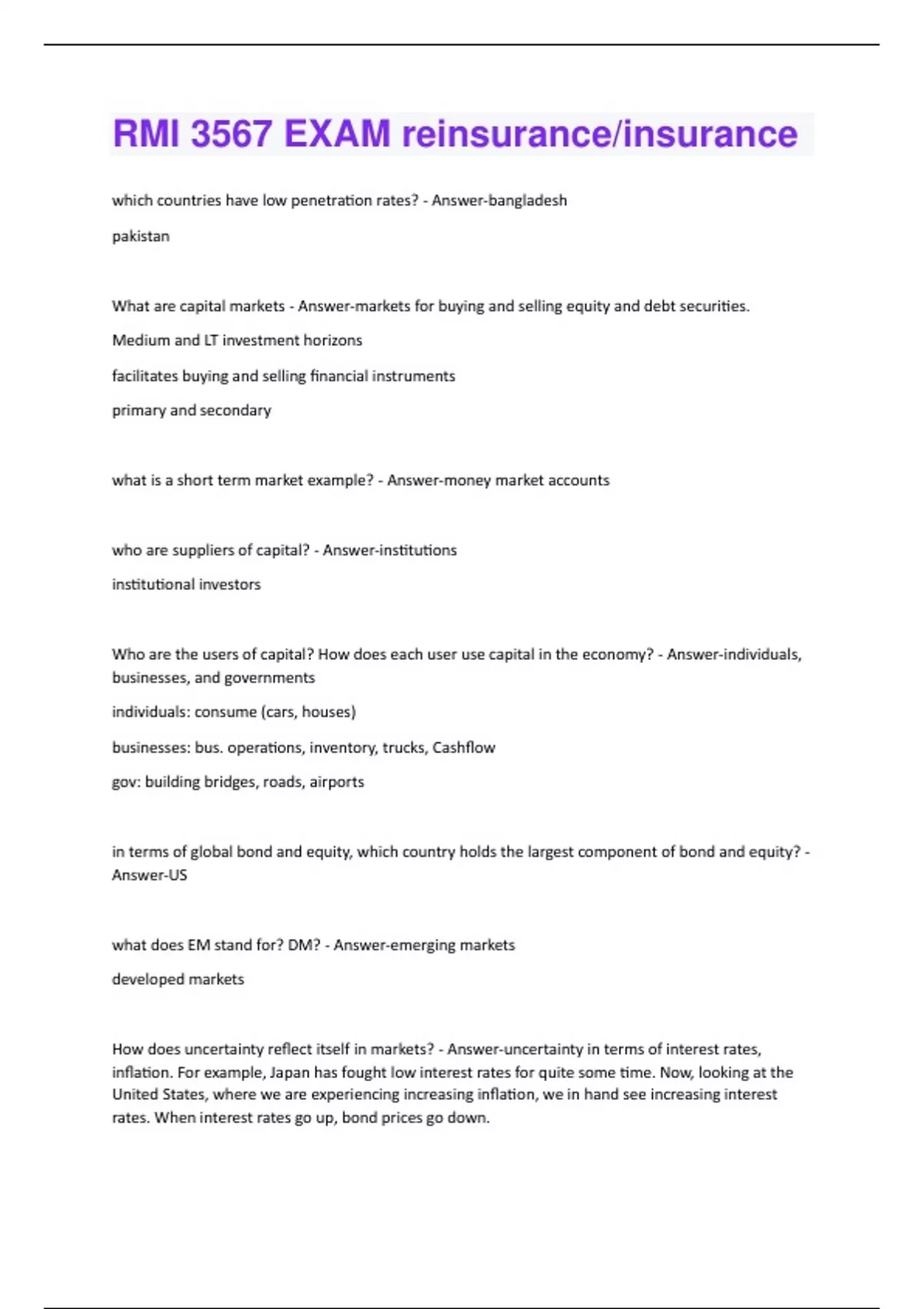 which countries have low penetration rates? - Answer-bangladesh pakistan What are capital markets - Answer-markets for buying and selling equity and debt securities. Medium and LT investment horizons facilitates buying and selling financial instruments primary and secondary what is a short term market example? - Answer-money market accounts who are suppliers of capital? - Answer-institutions institutional investors Who are the users of capital? How does each user use capital in the economy? - Answer-individuals, businesses, and governments individuals: consume (cars, houses) businesses: bus. operations, inventory, trucks, Cashflow gov: building bridges, roads, airports in terms of global bond and equity, which country holds the largest component of bond and equity? - Answer-US what does EM stand for? DM? - Answer-emerging markets developed markets How does uncertainty reflect itself in markets? - Answer-uncertainty in terms of interest rates, inflation. For example, Japan has fought low interest rates for quite some time. Now, looking at the United States, where we are experiencing increasing inflation, we in hand see increasing interest rates. When interest rates go up, bond prices go top ten countries for direct premium written - Answer-1. US 2.China 3.Japan 4.UK 5.France 6.Germany 7.South Korea 8.Italy 9.Canada 10.India what are some key things to note/retain from the top ten countries listed for direct premium? - Answer-China and India both have incredibly large populations. However, China is #2, but India is #10. India is on the bottom because it experiences more government constraints, but the country is moving up. 25 years ago China wouldn't have been on the list. top 10 countries by life and nonlife direct premium written - Answer-1. US 2.PR China 4.UK 5.France 6.Germany korea a