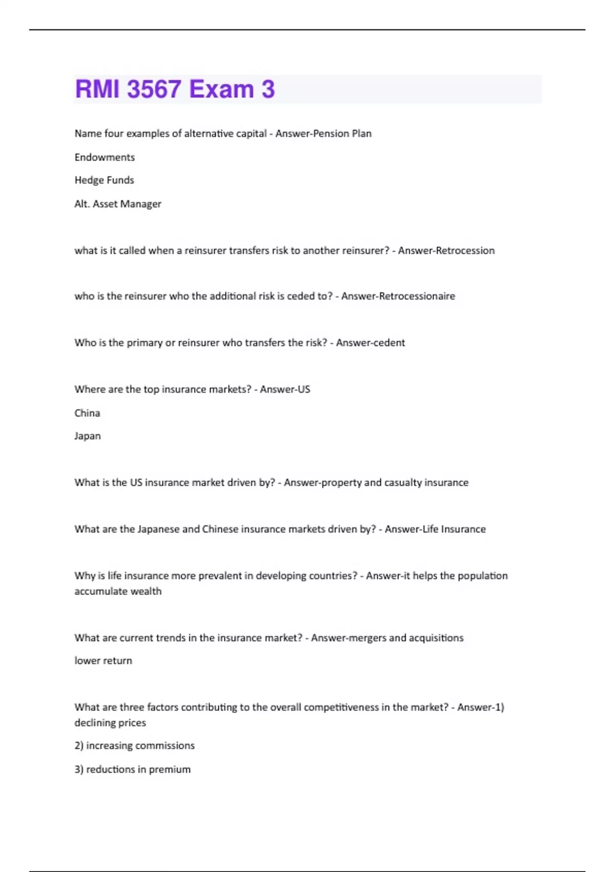 Name four examples of alternative capital - Answer-Pension Plan Endowments Hedge Funds Alt. Asset Manager what is it called when a reinsurer transfers risk to another reinsurer? - Answer-Retrocession who is the reinsurer who the additional risk is ceded to? - Answer-Retrocessionaire Who is the primary or reinsurer who transfers the risk? - Answer-cedent Where are the top insurance markets? - Answer-US China Japan What is the US insurance market driven by? - Answer-property and casualty insurance What are the Japanese and Chinese insurance markets driven by? - Answer-Life Insurance Why is life insurance more prevalent in developing countries? - Answer-it helps the population accumulate wealth What are current trends in the insurance market? - Answer-mergers and acquisitions lower return What are three factors contributing to the overall competitiveness in the market? - Answer-1) declining prices 2) increasing commissions 3) reductions in premiumWhat drives mergers and acquisitions activity? - Answer-Competitiveness Lower returns put increased pressure on underwriters which in return will cause what three things to occur? - Answer-1. More conservative UW 2. More diversification 3. Increase international reach Where do sources of new risk capital originated from? - Answer-Secondary Markets What are four risk transfer mechanisms? - Answer-1) Cat Bonds 2) Insurance Linked Securities 3) Collateralized reinsurance 4) Sidecars What contributed to the decrease in reinsurance pricing? - Answer-- abundance of capital - diversification in the market following the 2005 losses What has an abundance of capital done to the market? - Answer-created more capacity within the market driven RoL to pre 9/11 level What could potentially drive up rates in the reinsurance market? - Answer-natural disasters What were the three events that led to significant changes in the reinsurance market? - AnswerHurricane Andrew 1992 9/11 Hurricane Katrina, Rita and Wilma 2005 What reinsurer was formed after Hurricane Andrew? - Answer-Bermuda became hub for property catastrophe reinsuranceRenRe was formed What companies were created after 9/11? - Answer-Arch Capital AXIS Allied World Endurance What companies formed after Hurricane Katrina, Rita and Wilma? - Answer-Validus Flagstone Harbor Point How are recent events going to impact the pricing of reinsurance in 2019? - Answer-Natural disasters have been known to drive rates up, however due to the availability of capital and the increase in capacity the rate increase will be insignificant. How did the Bermuda market form? - Answer-emerged out of liability crisis of the mid 1980's as the world's most pre-eminent offshore reinsurance market What led to the creation of RRG's and Captives? - Answer-children falling off swings Why were people skeptical of the Bermuda market? - Answer-political risk restrictive infrastructure high cost operating environment Why do US lawmakers not like the Bermuda market? - Answer-Bermuda has a tax advantage that the US does not have What disrupted the Bermuda market? - Answer-Insurance Linked Securities (ILS) Do international insurers prefer multiple solvency standards or one? - Answer-One because it is more simpleharmonized way of regulation easier/cheaper What are the three RBC property-liability risk classes? - Answer-1. asset risk 2. credit risk 3. underwriting risk What are the three pillars of Solvency II? - Answer-1) Quantitative Requirements 2) Governance & Supervision 3) Disclosure & Transparency What mergers have occurred with companies in Bermuda? - Answer-AIG - Validus XL Catlin - AXA Axis - Novae The pattern of publicly traded Bermudian to be purchased in the last 3 years have led to what? - Answer-jobs disappearing operational shrinkage The Final Class of insurers formed after Hurricanes KWR why? - Answer-Because the market recognized that long-term permanent capital was not the most profitable way to approach reinsuring short-tail risks When was the EU founded? - Answer-1957 Who were the initial 6 countries that were in the European Union? - Answer-West Germany France ItalyBelgium Netherlands Luxemburg Economically, what is the EU responsible for? - Answer-The Euro external trade negotiations overseeing the single market competition policy EU budget