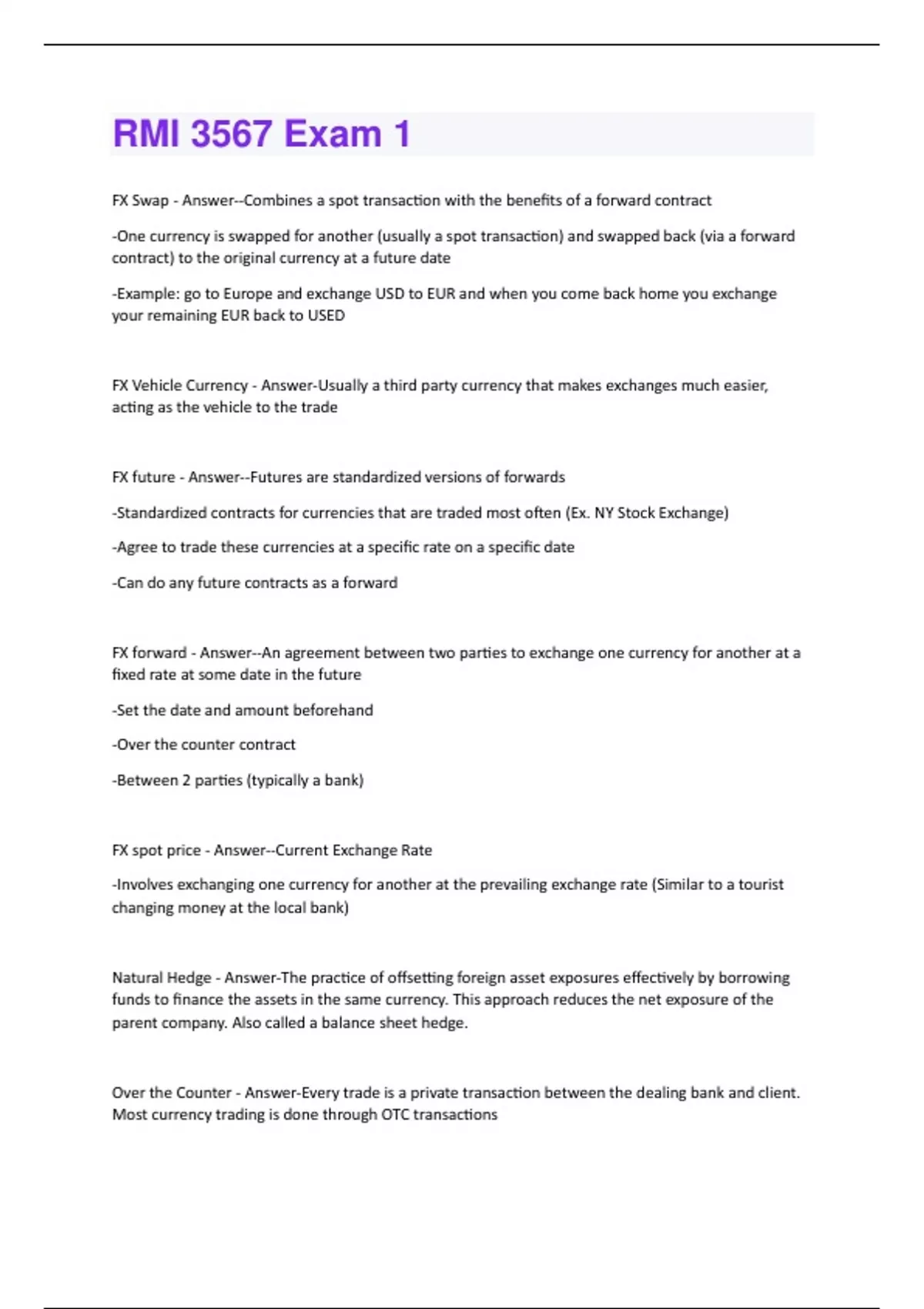 FX Swap - Answer--Combines a spot transaction with the benefits of a forward contract -One currency is swapped for another (usually a spot transaction) and swapped back (via a forward contract) to the original currency at a future date -Example: go to Europe and exchange USD to EUR and when you come back home you exchange your remaining EUR back to USED FX Vehicle Currency - Answer-Usually a third party currency that makes exchanges much easier, acting as the vehicle to the trade FX future - Answer--Futures are standardized versions of forwards -Standardized contracts for currencies that are traded most often (Ex. NY Stock Exchange) -Agree to trade these currencies at a specific rate on a specific date -Can do any future contracts as a forward FX forward - Answer--An agreement between two parties to exchange one currency for another at a fixed rate at some date in the future -Set the date and amount beforehand -Over the counter contract -Between 2 parties (typically a bank) FX spot price - Answer--Current Exchange Rate -Involves exchanging one currency for another at the prevailing exchange rate (Similar to a tourist changing money at the local bank) Natural Hedge - Answer-The practice of offsetting foreign asset exposures effectively by borrowing funds to finance the assets in the same currency. This approach reduces the net exposure of the parent company. Also called a balance sheet hedge. Over the Counter - Answer-Every trade is a private transaction between the dealing bank and client. Most currency trading is done through OTC transactionsOFAC - Answer-Office of Foreign Assets Control- monitors and prhobits companies from completing ecomnomic deals with sanctioned countries. Violation can occur in heavy fines for the company in violation OFAC License - Answer-Two types- General and Specific General- Authorizes a type of transaction for a class of persons without the need to apply for the license Specific- A particular person or entity in response to a written application FCPA - Answer-Designed to prevent bribery, specifically attempts to bribe foreign governmantal decisions, and prohibits bribery from foreigners to U.S. officials Disgorgement - Answer-In legal usage, the forced giving up of profits made through illegal activity, most commonly insider trading. Foreign direct investment - Answer-Investment made by an individual or organization to give it direct control/ decision making power (ex. majority equity stake in a firm) foreign portfolio investment - Answer-investments without controlling power (ex. minority stake in a firm) Forced abandonment - Answer-A company having to leave their current place of work due to unsafe working conditions from threats around the location (protests, war) Currency convertibility risks - Answer--Profits, dividends, inter-company debit servicing and any repatriation of funds can be considered. Often happens at times of financial crisis -The RISK of loss arising from an inability to convert local currency into a fully CONVERTIBLE CURRENCY and/or to repatriate convertible currency back to a home country as a result of EXCHANGE CONTROLS Repatriate - Answer-to return to one's country of origin Expropriate - Answer-A host country seizing the assets of a foreign company (Mexico gas example) Expatriate - Answer-A U.S. citizen working in a foreign countryLocal national - Answer-Someone working in the same country they are a citizen of Third country national - Answer-Individuals working in countries that they are not citizens of Territory - Answer-Where a peril or loss occurs