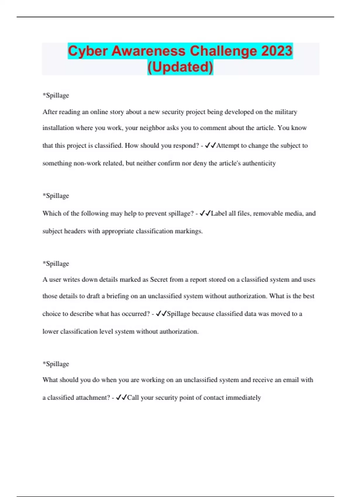 Cyber Awareness Challenge 2023 (Updated) *Spillage After reading an online story about a new security project being developed on the military installation where you work, your neighbor asks you to comment about the article. You know that this project is classified. How should you respond? - Attempt to change the subject to something non-work related, but neither confirm nor deny the article's authenticity *Spillage Which of the following may help to prevent spillage? - Label all files, removable media, and subject headers with appropriate classification markings. *Spillage A user writes down details marked as Secret from a report stored on a classified system and uses those details to draft a briefing on an unclassified system without authorization. What is the best choice to describe what has occurred? - Spillage because classified data was moved to a lower classification level system without authorization. *Spillage What should you do when you are working on an unclassified system and receive an email with a classified attachment? - Call your security point of contact immediately *Spillage What should you do if a reporter asks you about potentially classified information on the web? - Ask for information about the website, including the URL. *Spillage .What should you do if a reporter asks you about potentially classified information on the web? - Refer the reporter to your organization's public affairs office. *Spillage What should you do if you suspect spillage has occurred? - Immediately notify your security point of contact *Spillage Which of the following is a good practice to prevent spillage? - Be aware of classification markings and all handling caveats. *Spillage Which of the following actions is appropriate after finding classified information on the Internet? - Note any identifying information and the website's Uniform Resource Locator (URL) **Classified Data When classified data is not in use, how can you protect it? - Store classified data appropriately in a GSA-approved vault/container. **Classified Data What is required for an individual to access classified data? - Appropriate clearance, a signed and approved non-disclosure agreement, and need-to-know **Classified Data Which classification level is given to information that could reasonably be expected to cause serious damage to national security? - Secret **Classified Data Which of the following is a good practice to protect classified information? - Ensure proper labeling by appropriately marking all classified material and, when required, sensitive material **Classified Data Which of the following is true of protecting classified data? - Classified material must be appropriately marked. **Classified Data What level of damage can the unauthorized disclosure of information classified as Confidential reasonably be expected to cause? - Damage to national security **Classified Data