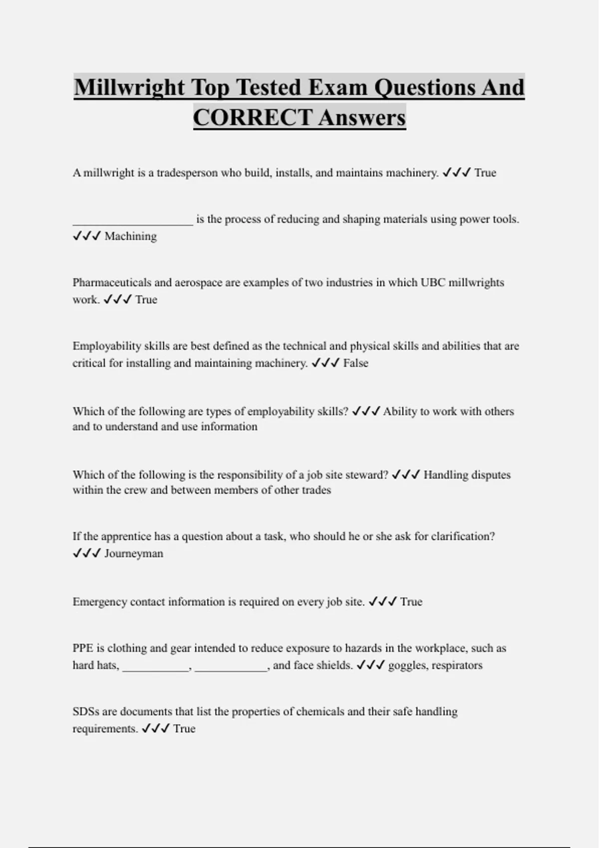 Millwright Top Tested Exam Questions And CORRECT Answers