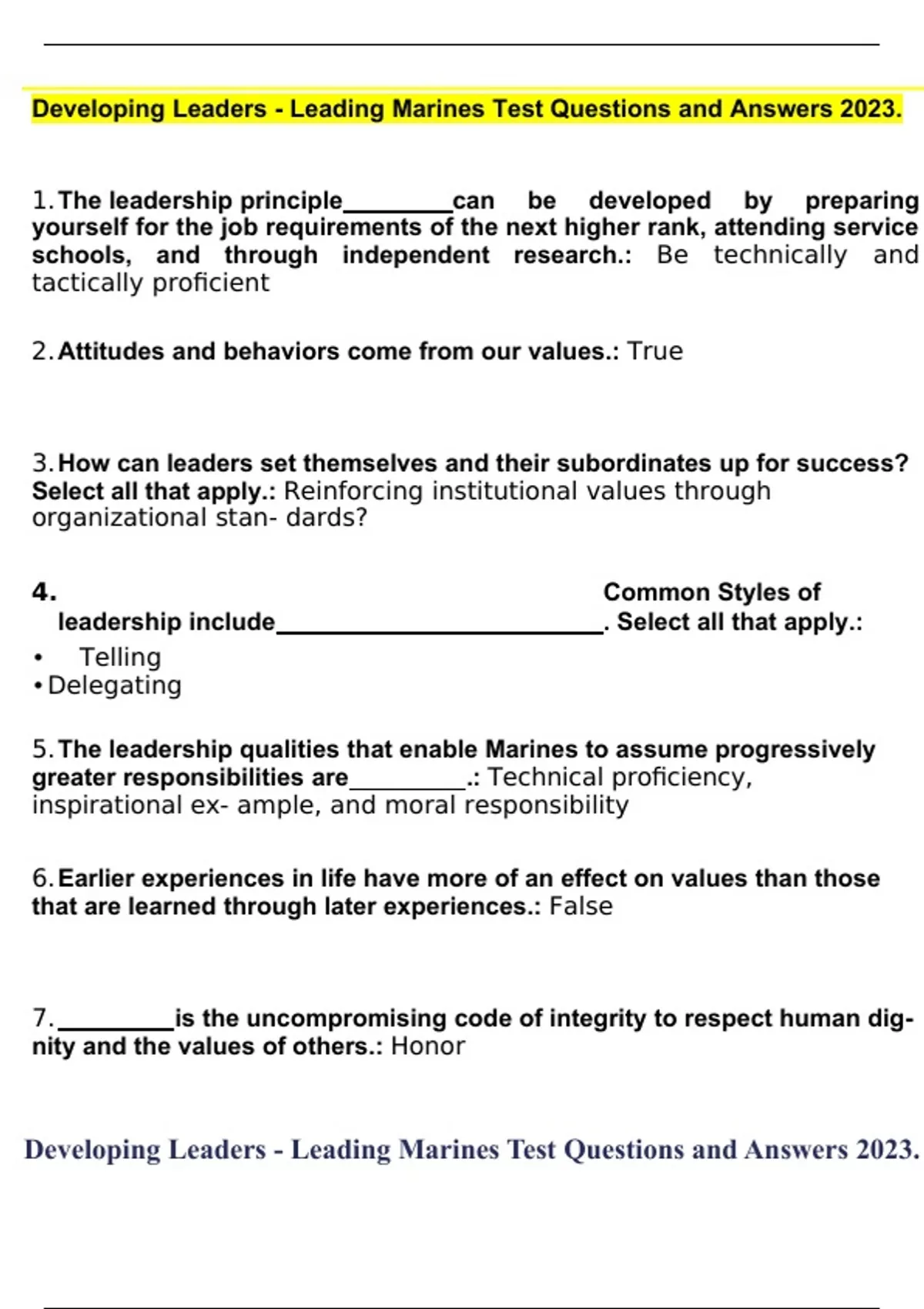 Developing Leaders - Leading Marines Test Questions and Answers 2023.