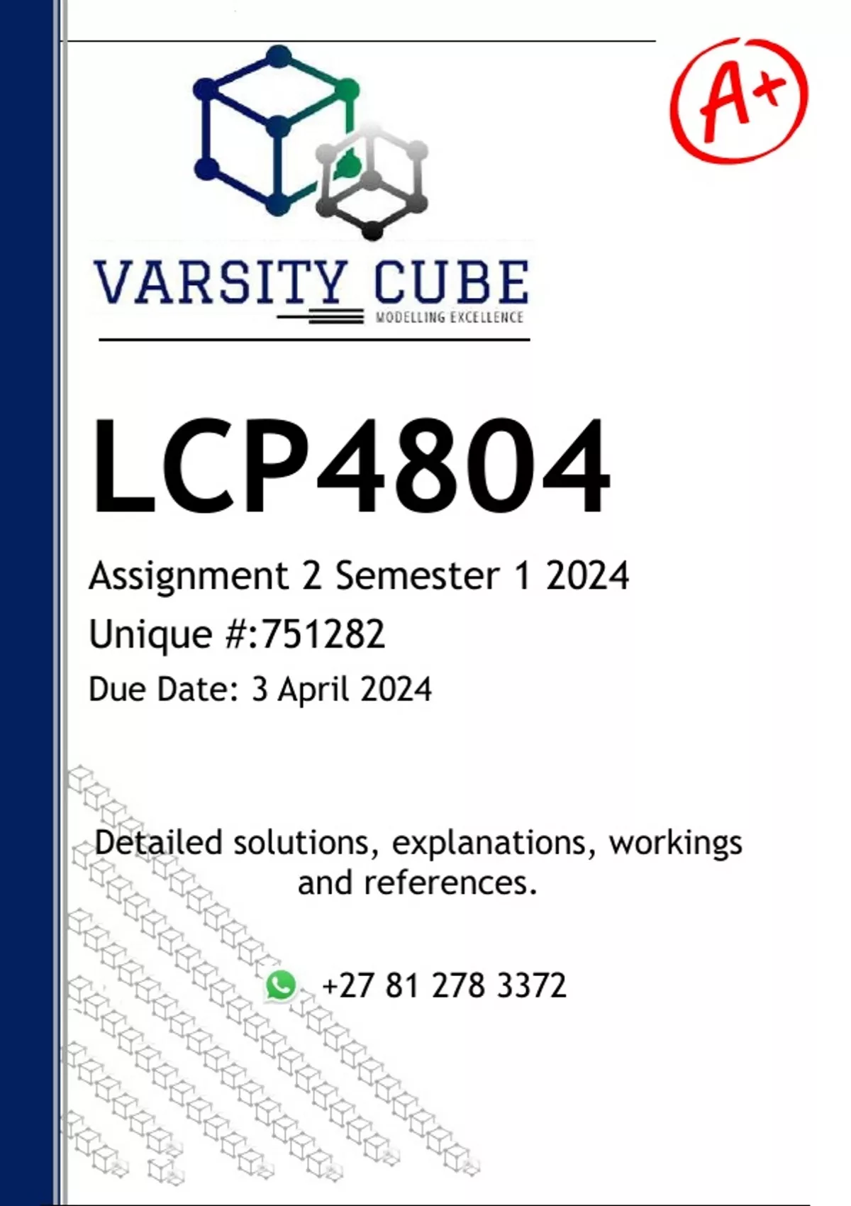 LCP4804 Assignment 2 (ANSWERS) Semester 1 2024 - DISTINCTION GUARANTEED. Answers, guidelines, workings and references...... Question 1 Tendai and Keneilwe were University sweethearts, and as soon as they graduated from university in 2015 decided to live together. In 2020, Tendai’s uncle intimated to the couple that he is prepared to assist them with initiating the talks between the families to start marriage negotiations for the couple. They both agreed and a meeting between the two families was arranged in May 2020 for the negotiations to begin. Although charging the R120,000 as the amount liable to be paid lobolo to Keneilwe’s family, an amount of R80,000 was agreed upon by the familied to at least be paid by Tendai’s family to be able to secure a marriage agreement with Keneilwe’s family. Tendai was only able to raise R50,000 and transferred this amount to Keneilwe’s family, regarding it as a deposit to the prescribed R80,000. The slaughtering of the cow ceremony to mark the conclusion of the marriage negotiations was postponed until the payment of the shortfall to R80,000 as the agreed amount by the families. Meanwhile, the couple had already bought and fully paid for the house they lived in at the time of their marriage negotiations which was registered under Tendai’s name. Soon after the R50,000 had been transferred to Keneilwe’s family, the couple also threw a lavish party in their house where they invited their friends and family members. At this party, Tendai had bought Keneilwe a special wedding ring and in his speech was referring to her as his wife as a video of the proceedings was also recorded. Moreover, in the following month, Tendai was able to add Keneilwe as his spouse in the medical insurance he was paying for. In August 2021, Tendai passed on due to the covid pandemic. When Keneilwe approached the Master’s office to claim from the estate as the surviving spouse, Tendai’s family appealed to the court to stop her, arguing that she is not recognised as their late son’s spouse due to the non-conclusion of the marriage negotiations which were to be marked by the slaughter of a cow. With the aid of decided cases including Motsoatsoa v Roro All SA 324 (GSJ); Maluleke v Minister of Home Affairs Case no 02/24921 [2008] ZAGPHC 129 (9 April 2008) (unreported); Mabuza v Mbatha 2003 (7) BCLR 43, Advise Keneilwe on the prospects of having her marriage to Tendai legally recognised as valid by the courts. Your discussion must reflect. - The legal question in each case (9) - The reasons for the decision for each case (9) - The decision arrived at by the courts in each case. (6) - A summary of the interpretation that can be ascribed to section 3(1)(b) for the requirements of a valid customary law marriage because of the above court decisions. (1) [25] Question 2 Provide a brief critical appraisal of the probative value of the contribution of the Reform of Customary law of Succession and Regulation of Related Matters Act 11 of 2009 in the development or otherwise of post-apartheid customary law. (5)