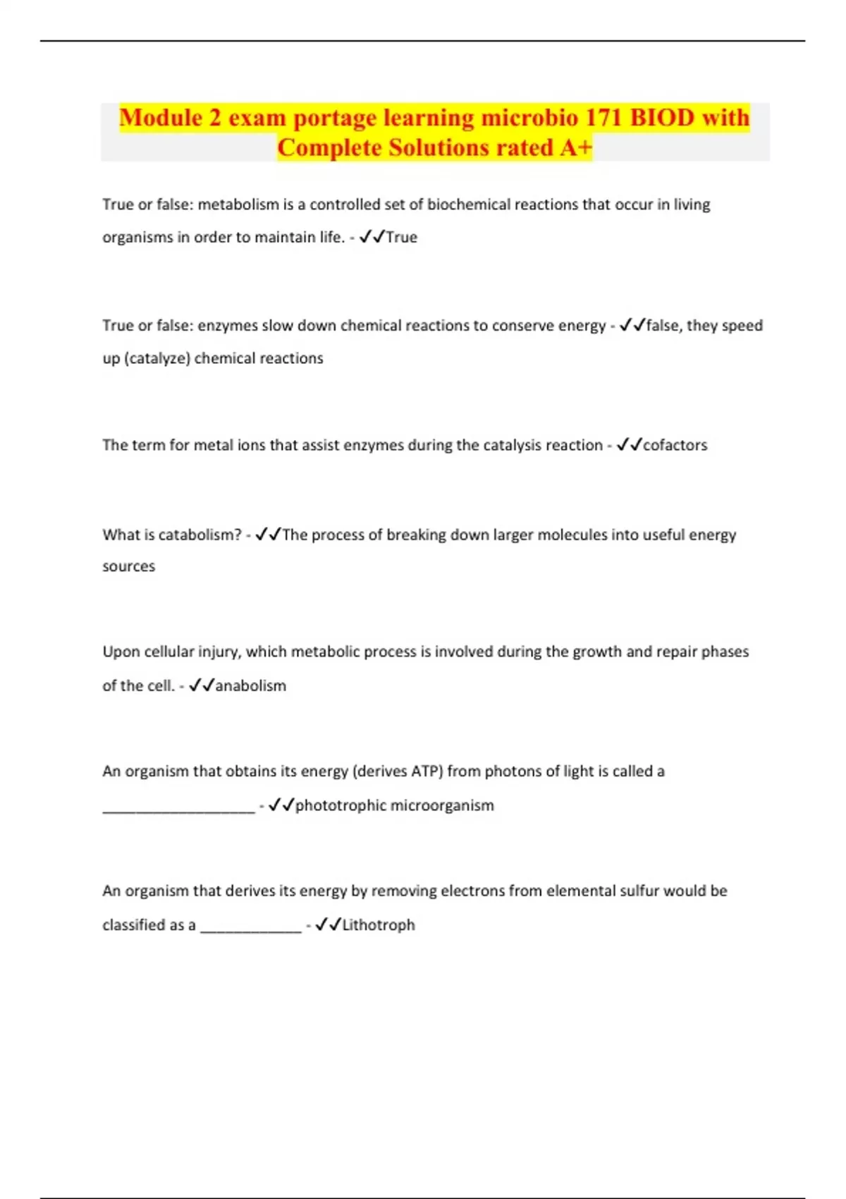 Module 2 exam portage learning microbio 171 BIOD with Complete Solutions rated A+ True or false: metabolism is a controlled set of biochemical reactions that occur in living organisms in order to maintain life. - ✔✔True True or false: enzymes slow down chemical reactions to conserve energy - ✔✔false, they speed up (catalyze) chemical reactions The term for metal ions that assist enzymes during the catalysis reaction - ✔✔cofactors What is catabolism? - ✔✔The process of breaking down larger molecules into useful energy sources Upon cellular injury, which metabolic process is involved during the growth and repair phases of the cell. - ✔✔anabolism An organism that obtains its energy (derives ATP) from photons of light is called a __________________ - ✔✔phototrophic microorganism An organism that derives its energy by removing electrons from elemental sulfur would be classified as a ____________ - ✔✔Lithotroph