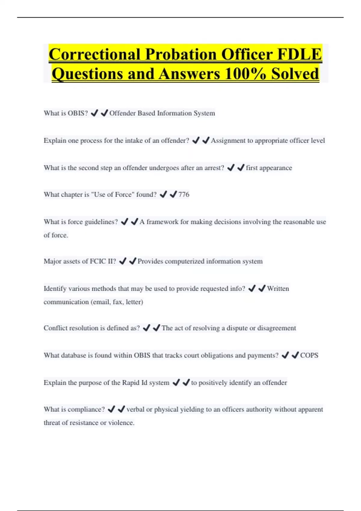 Correctional Probation Officer FDLE Questions and Answers 100% Solved What is OBIS? ️️Offender Based Information System Explain one process for the intake of an offender? ️️Assignment to appropriate officer level What is the second step an offender undergoes after an arrest? ️️first appearance What chapter is "Use of Force" found? ️️776 What is force guidelines? ️️A framework for making decisions involving the reasonable use of force. Major assets of FCIC II? ️️Provides computerized information system Identify various methods that may be used to provide requested info? ️️Written communication (email, fax, letter) Conflict resolution is defined as? ️️The act of resolving a dispute or disagreement