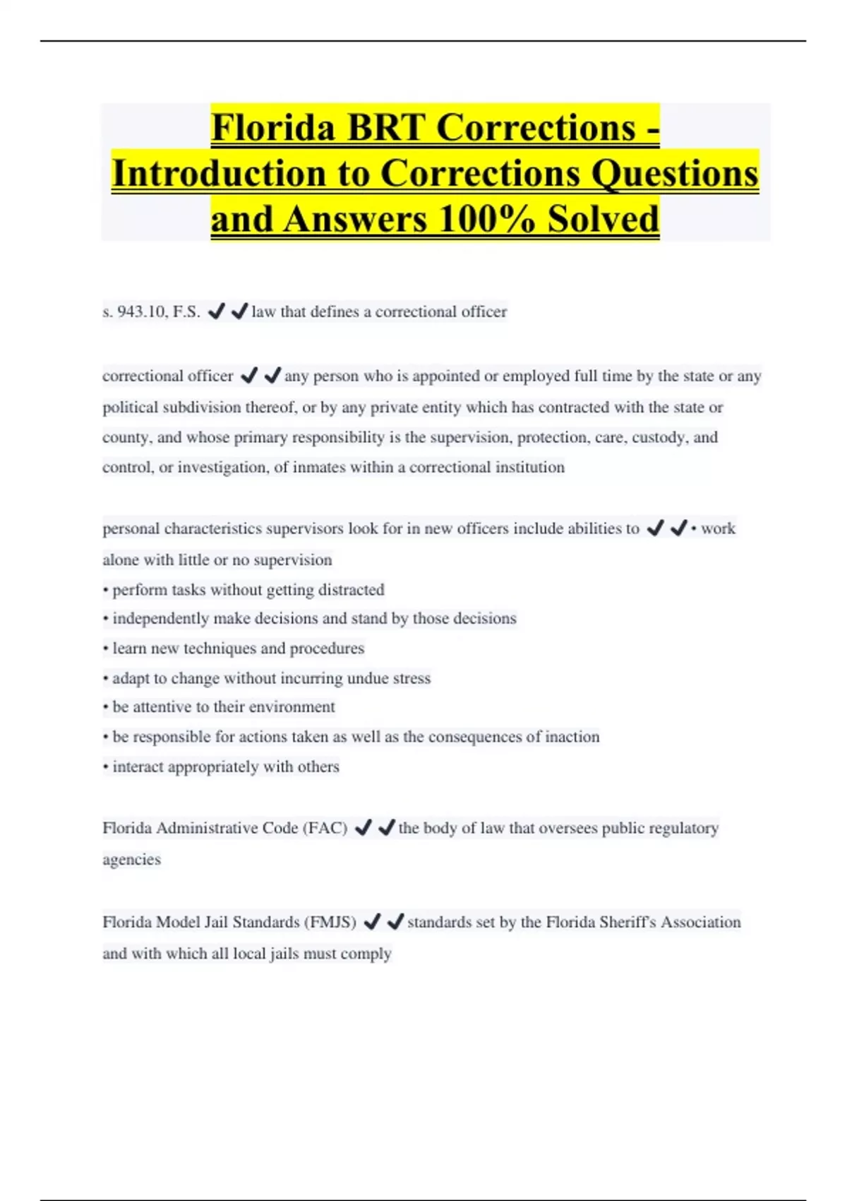 Florida BRT Corrections - Introduction to Corrections Questions and Answers 100% Solved s. 943.10, F.S. ️️law that defines a correctional officer correctional officer ️️any person who is appointed or employed full time by the state or any political subdivision thereof, or by any private entity which has contracted with the state or county, and whose primary responsibility is the supervision, protection, care, custody, and control, or investigation, of inmates within a correctional institution personal characteristics supervisors look for in new officers include abilities to ️️• work alone with little or no supervision • perform tasks without getting distracted • independently make decisions and stand by those decisions • learn new techniques and procedures • adapt to change without incurring undue stress • be attentive to their environment • be responsible for actions taken as well as the consequences of inaction • interact appropriately with others
