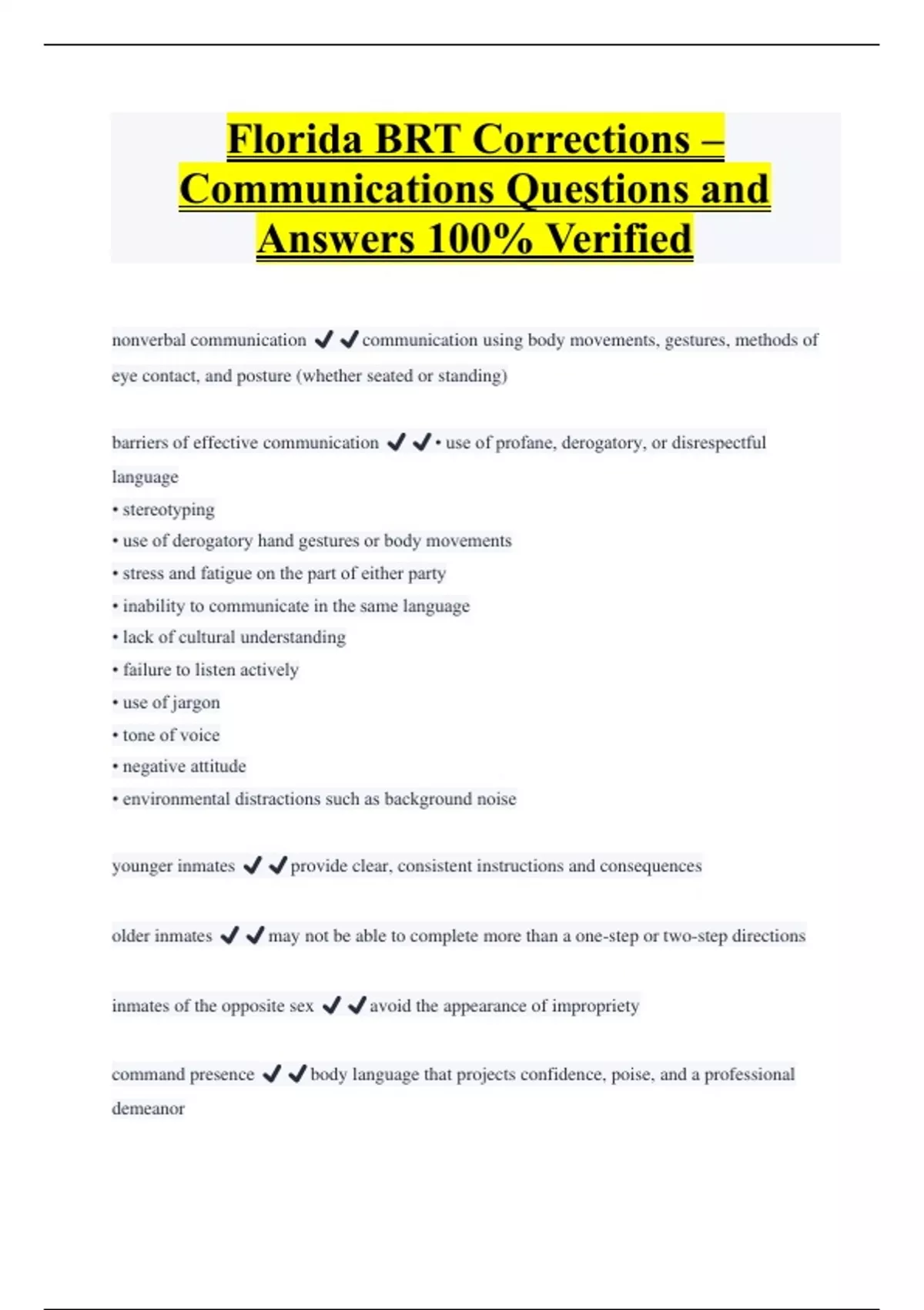 Florida BRT Corrections – Communications Questions and Answers 100% Verified nonverbal communication ️️communication using body movements, gestures, methods of eye contact, and posture (whether seated or standing) barriers of effective communication ️️• use of profane, derogatory, or disrespectful language • stereotyping • use of derogatory hand gestures or body movements • stress and fatigue on the part of either party • inability to communicate in the same language • lack of cultural understanding • failure to listen actively • use of jargon • tone of voice • negative attitude • environmental distractions such as background noise younger inmates ️️provide clear, consistent instructions and consequences older inmates ️️may not be able to complete more than a one-step or two-step directions inmates of the opposite sex ️️avoid the appearance of impropriety