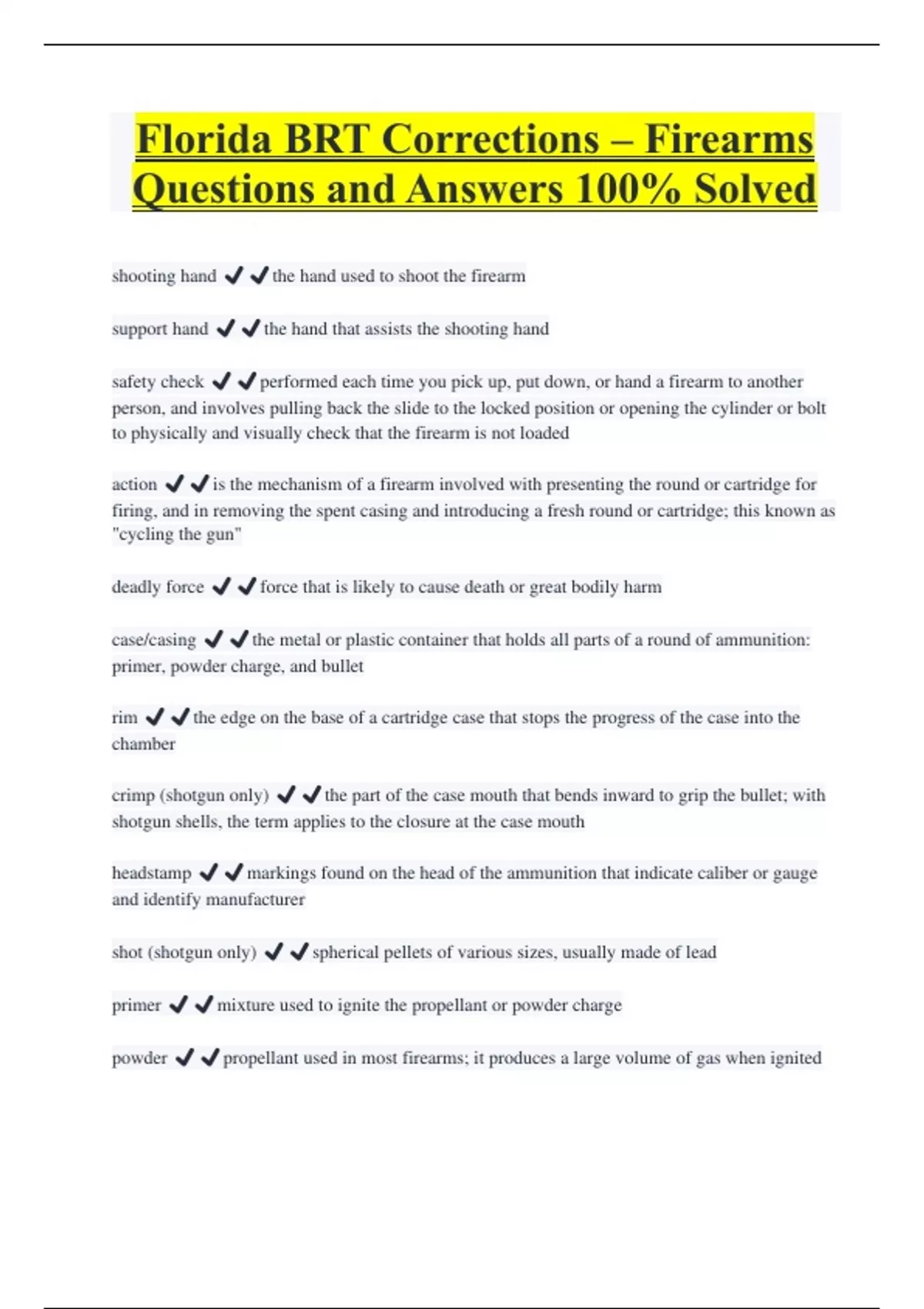 Florida BRT Corrections – Firearms Questions and Answers 100% Solved shooting hand ️️the hand used to shoot the firearm support hand ️️the hand that assists the shooting hand safety check ️️performed each time you pick up, put down, or hand a firearm to another person, and involves pulling back the slide to the locked position or opening the cylinder or bolt to physically and visually check that the firearm is not loaded action ️️is the mechanism of a firearm involved with presenting the round or cartridge for firing, and in removing the spent casing and introducing a fresh round or cartridge; this known as "cycling the gun" deadly force ️️force that is likely to cause death or great bodily harm case/casing ️️the metal or plastic container that holds all parts of a round of ammunition: primer, powder charge, and bullet rim ️️the edge on the base of a cartridge case that stops the progress of the case into the chamber crimp (shotgun only) ️️the part of the case mouth that bends inward to grip the bullet; with shotgun shells, the term applies to the closure at the case mouth headstamp ️️markings found on the head of the ammunition that indicate caliber or gauge and identify manufacturer