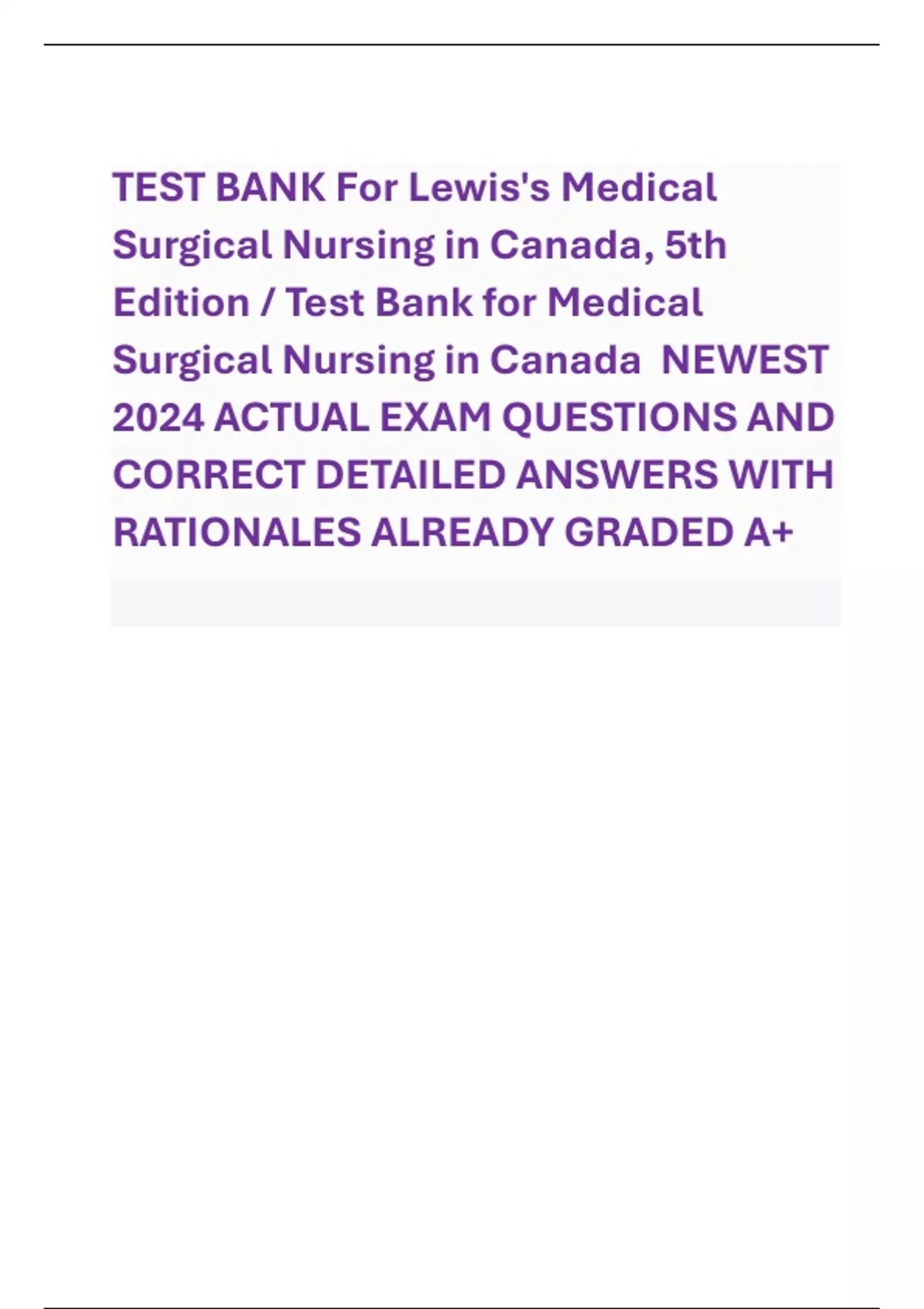 TEST BANK For Lewis's Medical Surgical Nursing in Canada, 5th Edition/ Test Bank for Medical Surgical Nursing in CanadaNEWEST 2024 ACTUAL EXAMQUESTIONS AND CORRECT DETAILED ANSWERS WITH RATIONALES ALREADY GRADED A+