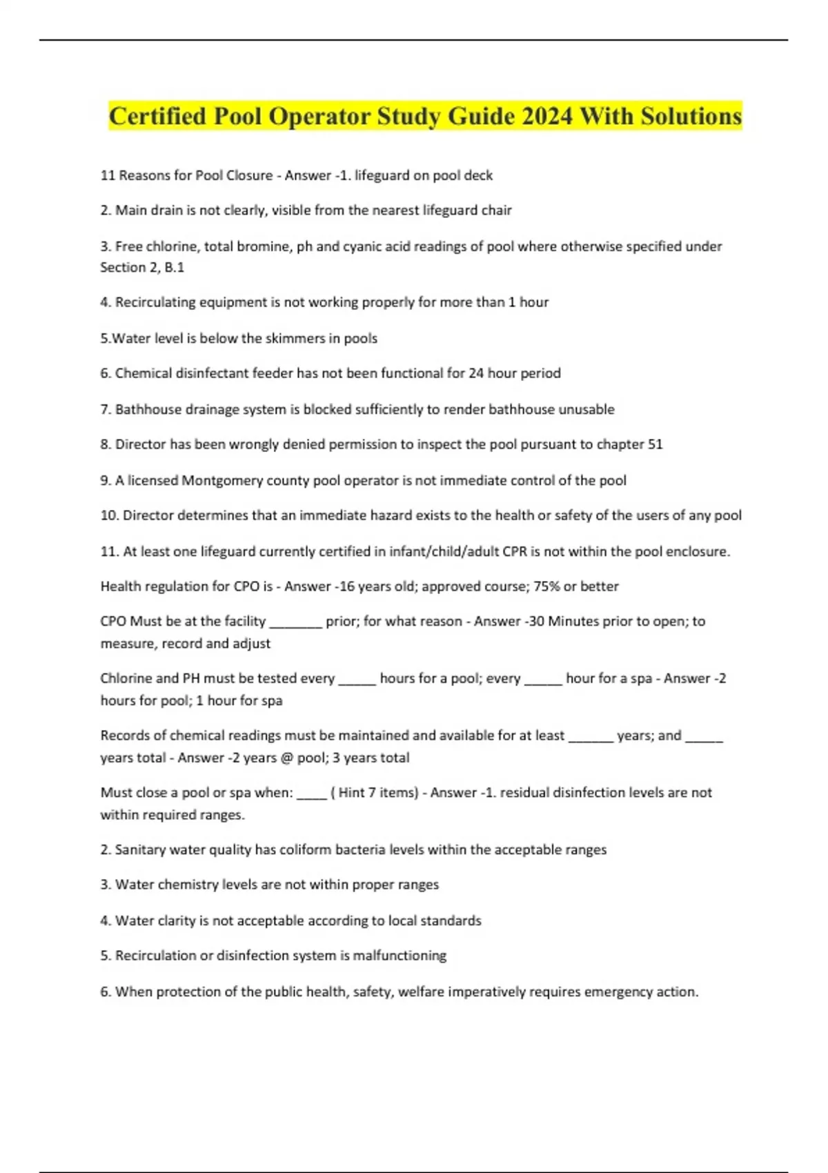 Certified Pool Operator Study Guide 2024 With Solutions 11 Reasons for Pool Closure - Answer -1. lifeguard on pool deck 2. Main drain is not clearly, visible from the nearest lifeguard chair 3. Free chlorine, total bromine, ph and cyanic acid readings of pool where otherwise specified under Section 2, B.1 4. Recirculating equipment is not working properly for more than 1 hour 5.Water level is below the skimmers in pools 6. Chemical disinfectant feeder has not been functional for 24 hour period 7. Bathhouse drainage system is blocked sufficiently to render bathhouse unusable 8. Director has been wrongly denied permission to inspect the pool pursuant to chapter 51 9. A licensed Montgomery county pool operator is not immediate control of the pool 10. Director determines that an immediate hazard exists to the health or safety of the users of any pool 11. At least one lifeguard currently certified in infant/child/adult CPR is not within the pool enclosure. Health regulation for CPO is - Answer -16 years old; approved course; 75% or better CPO Must be at the facility _______ prior; for what reason - Answer -30 Minutes prior to open; to measure, record and adjust Chlorine and PH must be tested every _____ hours for a pool; every _____ hour for a spa - Answer -2 hours for pool; 1 hour for spa Records of chemical readings must be maintained and available for at least ______ years; and _____ years total - Answer -2 years @ pool; 3 years total Must close a pool or spa when: ____ ( Hint 7 items) - Answer -1. residual disinfection levels are not within required ranges. 2. Sanitary water quality has coliform bacteria levels within the acceptable ranges 3. Water chemistry levels are not within proper rang