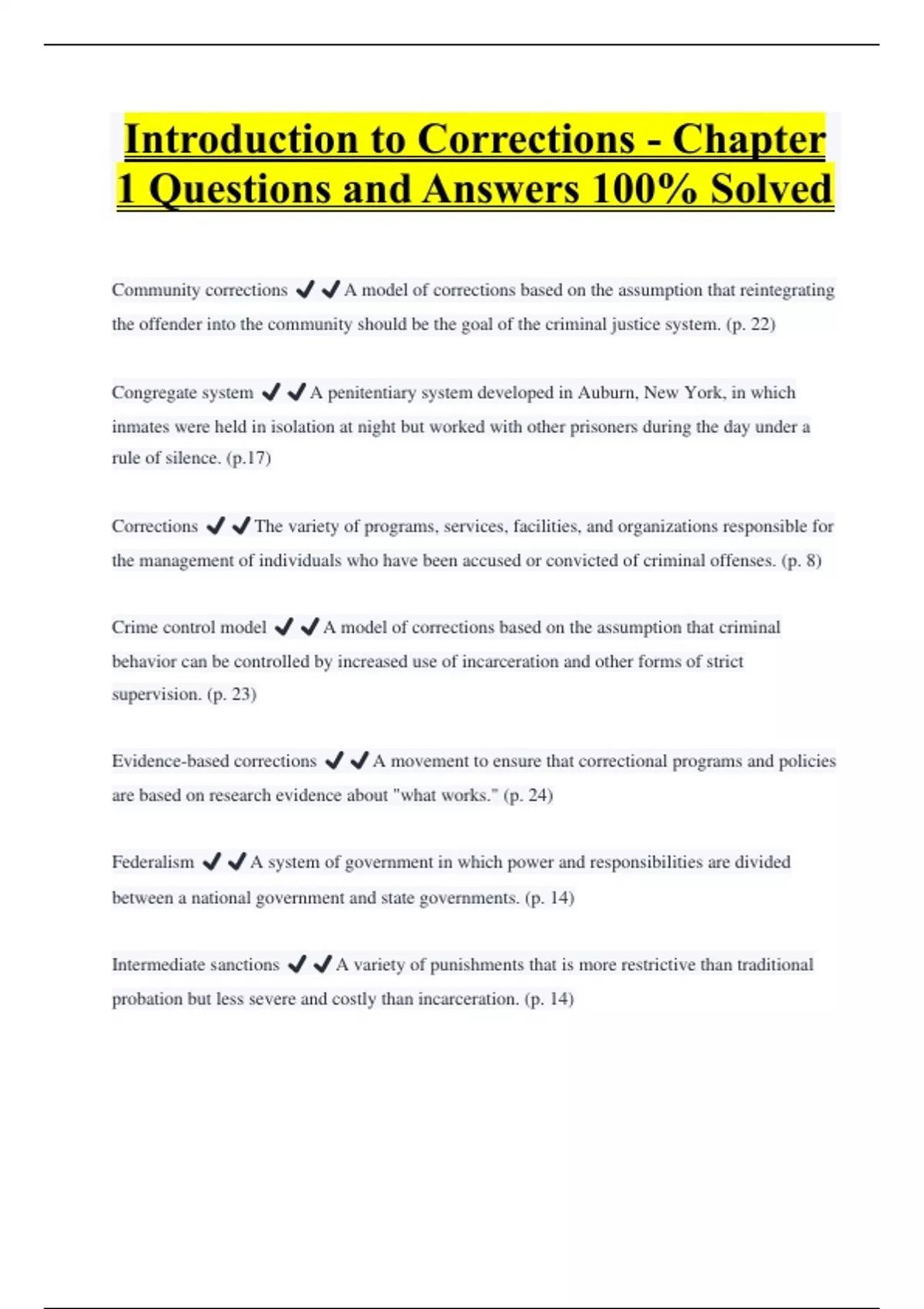 Introduction to Corrections - Chapter 1 Questions and Answers 100% Solved Community corrections ️️A model of corrections based on the assumption that reintegrating the offender into the community should be the goal of the criminal justice system. (p. 22) Congregate system ️️A penitentiary system developed in Auburn, New York, in which inmates were held in isolation at night but worked with other prisoners during the day under a rule of silence. (p.17) Corrections ️️The variety of programs, services, facilities, and organizations responsible for the management of individuals who have been accused or convicted of criminal offenses. (p. 8) Crime control model ️️A model of corrections based on the assumption that criminal behavior can be controlled by increased use of incarceration and other forms of strict supervision. (p. 23) Evidence-based corrections ️️A movement to ensure that correctional programs and policies are based on research evidence about "what works." (p. 24) Federalism ️️A system of government in which power and responsibilities are divided between a national government and state governments. (p. 14)
