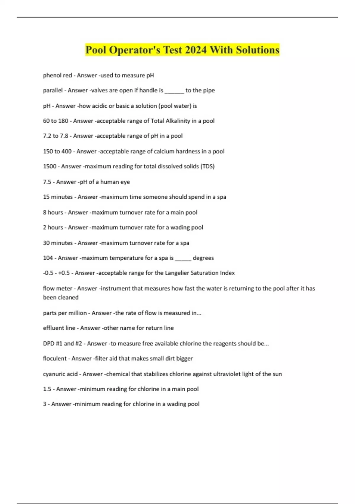 Pool Operator's Test 2024 With Solutions phenol red - Answer -used to measure pH parallel - Answer -valves are open if handle is ______ to the pipe pH - Answer -how acidic or basic a solution (pool water) is 60 to 180 - Answer -acceptable range of Total Alkalinity in a pool 7.2 to 7.8 - Answer -acceptable range of pH in a pool 150 to 400 - Answer -acceptable range of calcium hardness in a pool 1500 - Answer -maximum reading for total dissolved solids (TDS) 7.5 - Answer -pH of a human eye 15 minutes - Answer -maximum time someone should spend in a spa 8 hours - Answer -maximum turnover rate for a main pool 2 hours - Answer -maximum turnover rate for a wading pool 30 minutes - Answer -maximum turnover rate for a spa 104 - Answer -maximum temperature for a spa is _____ degrees -0.5 - +0.5 - Answer -acceptable range for the Langelier Saturati